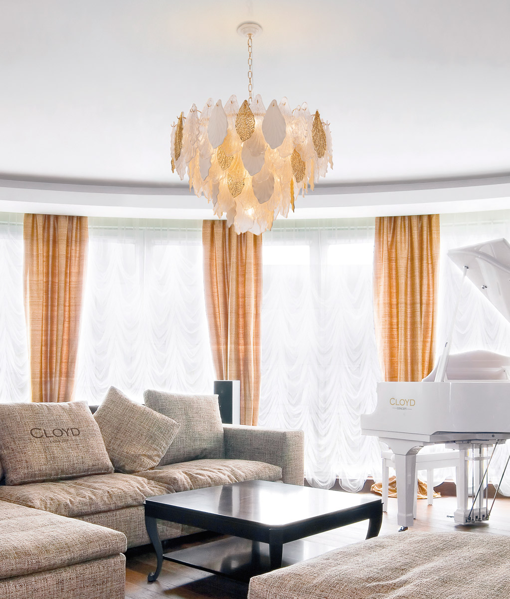 Люстра подвесная Cloyd SENEGAL (Клойд Сенегал) C21 / арт.10367, ø: 80 см. высота: 60 см (подвес в комплекте - до 50 см), источник света: E14 х 21 шт, цвет металла - золото блестящее. Особенности: керамика высокого качества.Гарантия: 1 год.