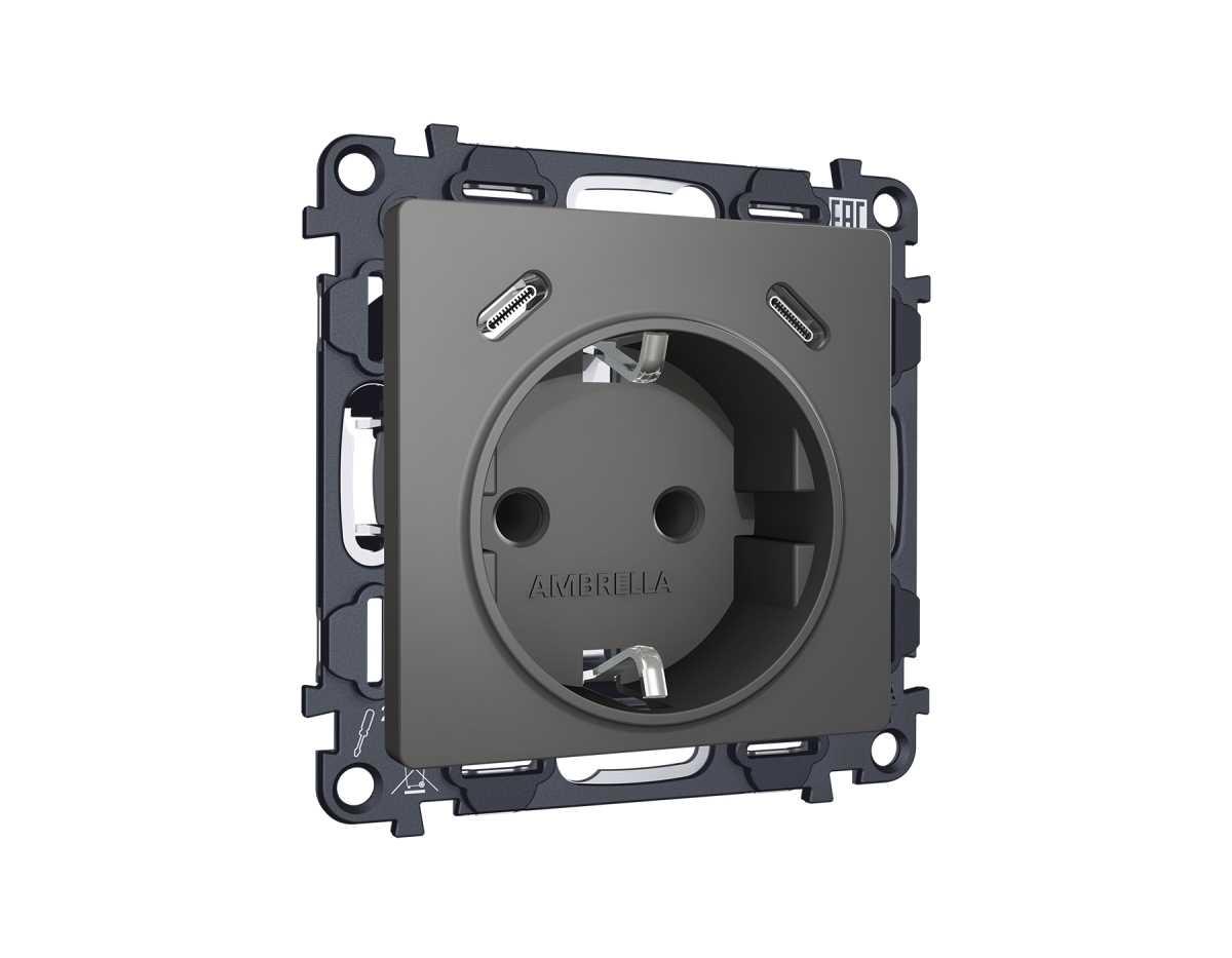 Комплект механизма электрической розетки 2USB С+C 20W с/з на винтовых зажимах 16A-250V Ambrella Volt ALFA Антрацит серый QUANT (AP6605,VM165) MA660510