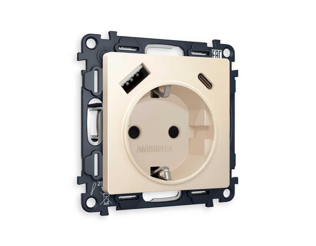 Комплект механизма электрической розетки AMBRELLA VOLT ALFA Бежевый матовый 2USB A+C 20W (быстрая зарядка) с/з QUANT (AP3300, VM160) MA330010