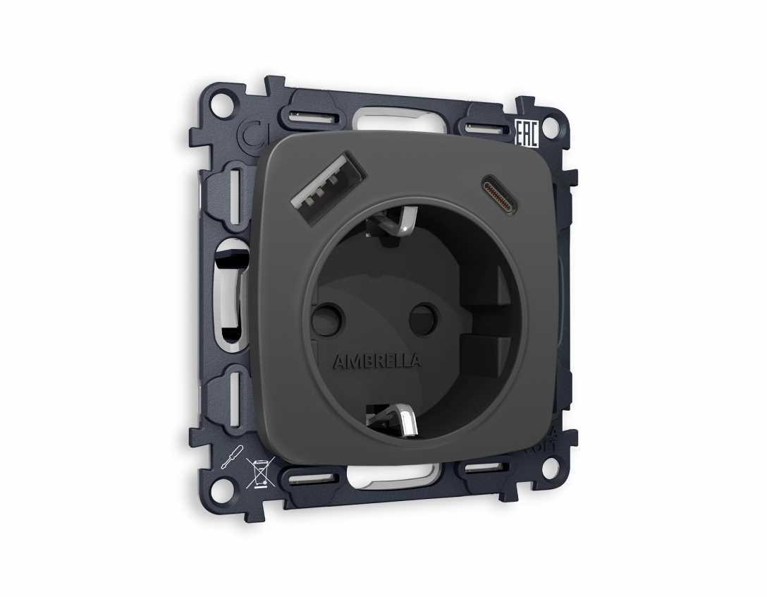 Комплект механизма электрической розетки AMBRELLA VOLT OMEGA Графит мягкое касание 2USB A+C 20W (быстрая зарядка) с/з QUANT (OP9100, VM160) MO910010