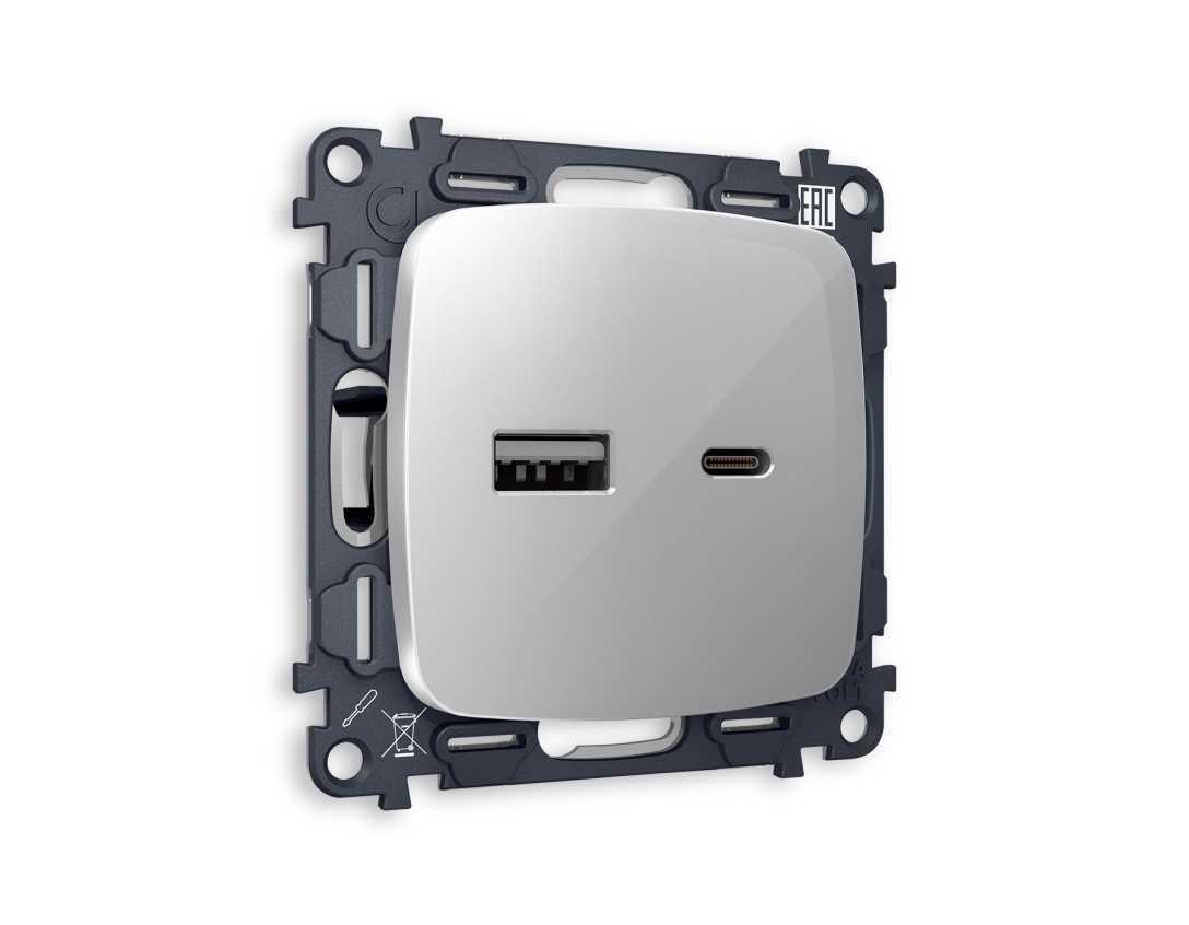 Комплект механизма розетки AMBRELLA VOLT OMEGA Серебро глянец 2USB A+C 20W (быстрая зарядка) QUANT (OP4110, VM177) MO411010