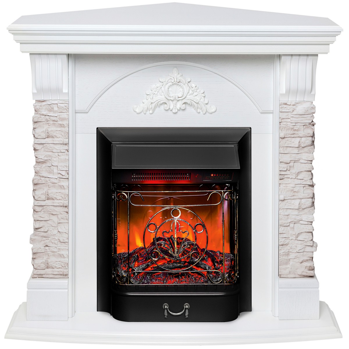 Каминокомплект ATHENA CORNER/АТЛАНТА УГЛ. GR Белый дуб с очагом Электроочаг MAJESTIC LUX RC/МАДЖЕСТИК С ПУЛЬТОМ