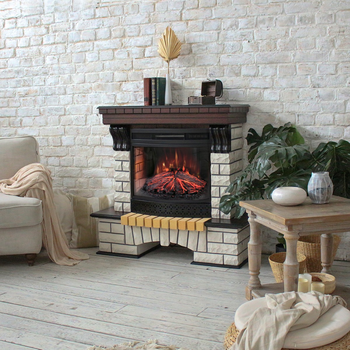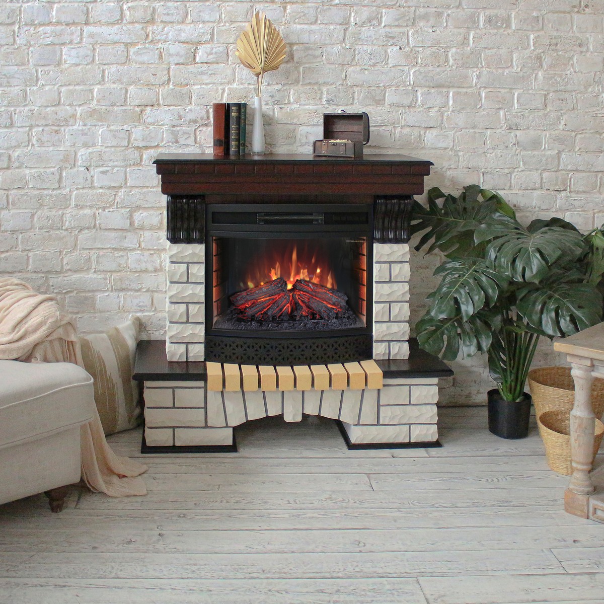 Обрамление в стиле кантри изготовлено из искусственного белого камня и шпонированного МДФ. Очаг обладает функцией инфракрасного прогрева и звуковым эффектом потрескивания дров. Нагреватель спрятан в верхней части очага и обеспечивает обогрев в холодную погоду. Качественный и надежный электрокамин будет радовать Вас не один год.