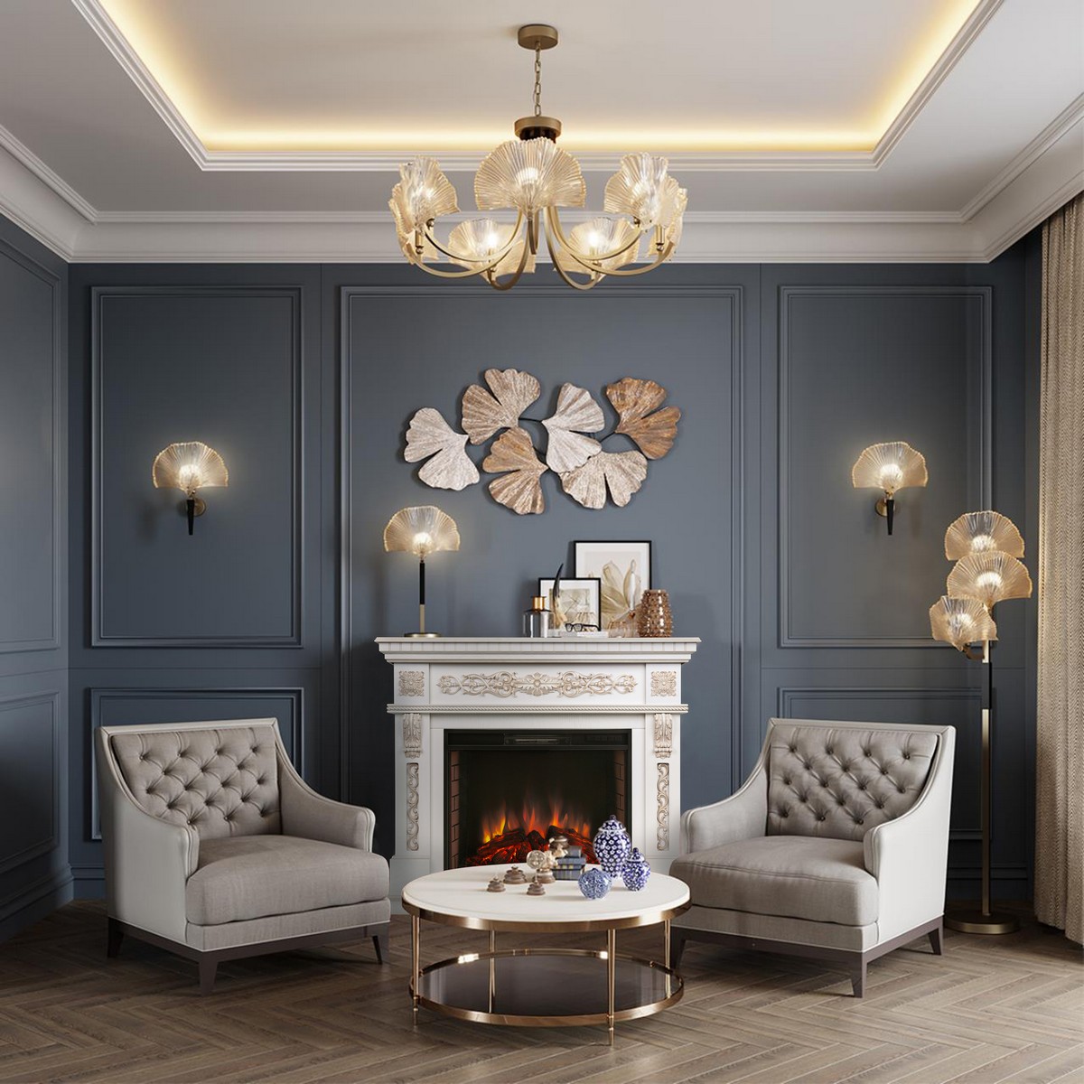 Каминокомплект ESTELLA/ЭЛЛИ Белый дуб с золотой патиной с очагом Электроочаг EPSILON 26