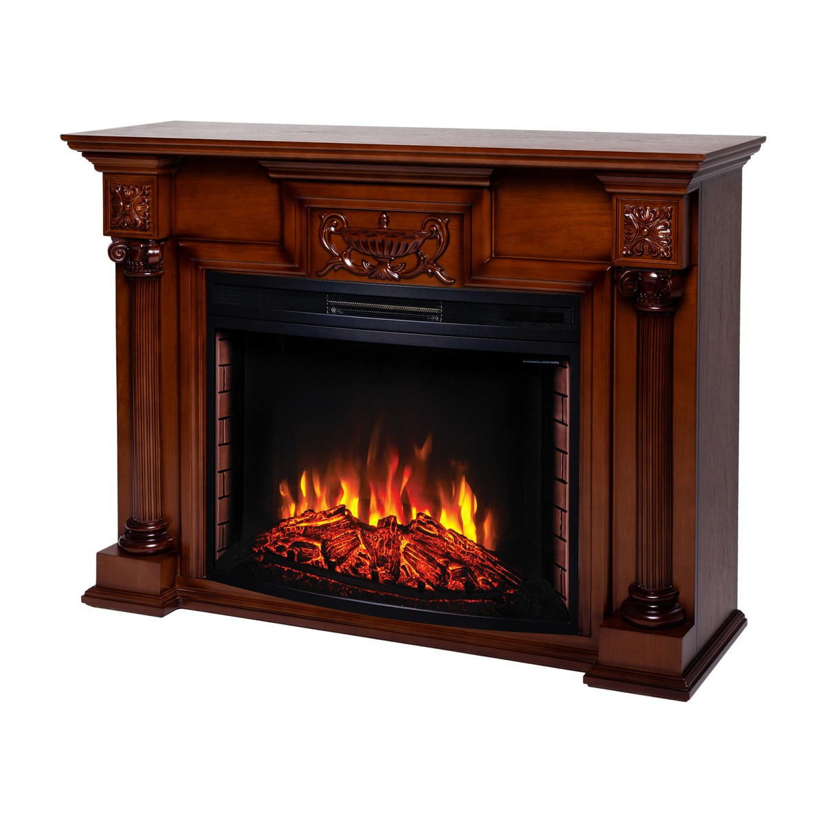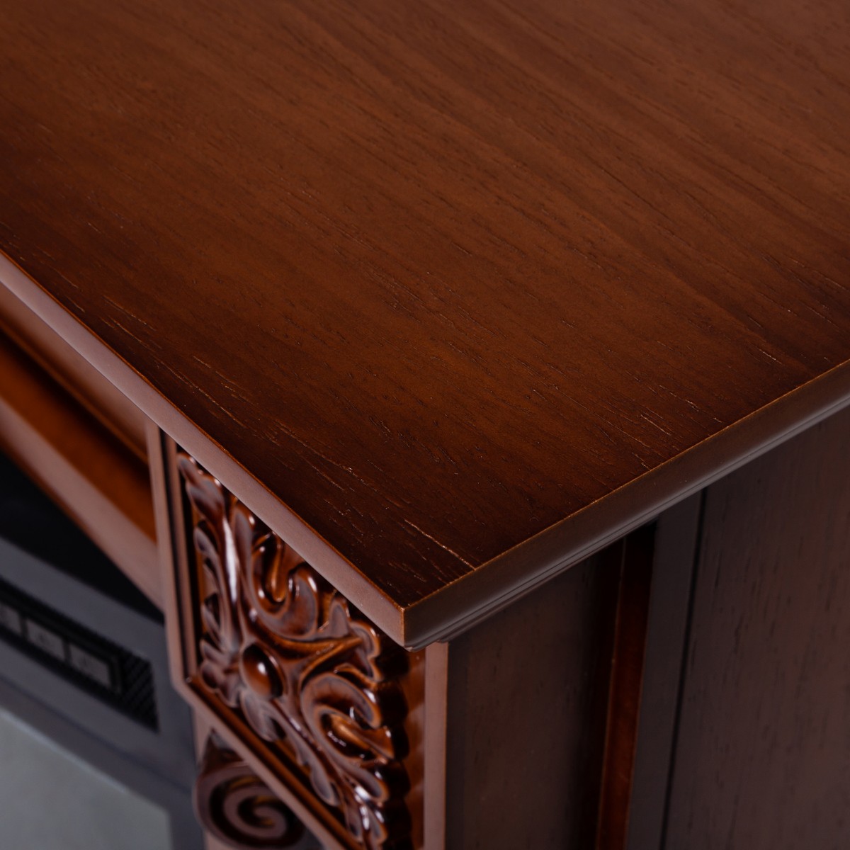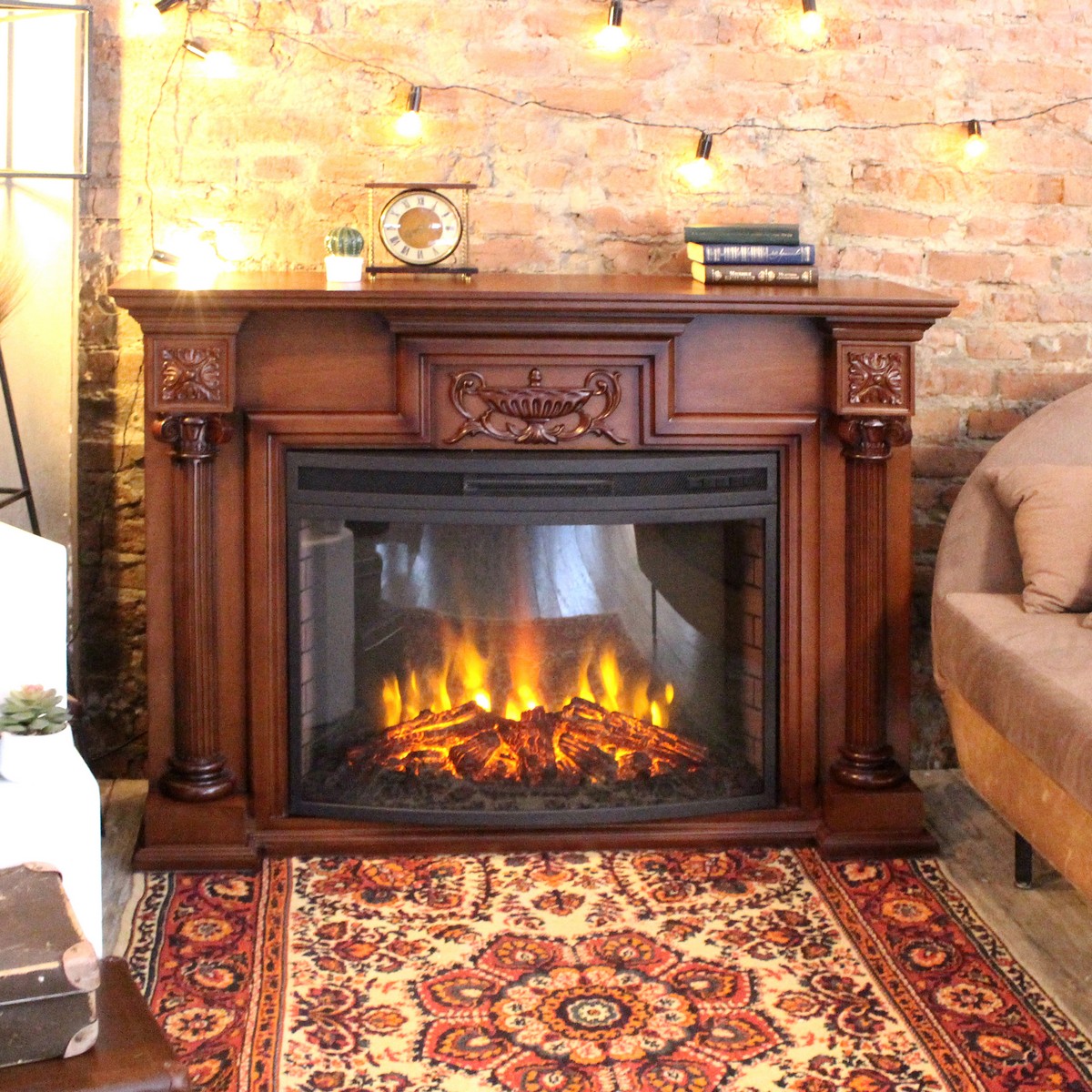 Электрический камин London с очагом Firespace 33 SIR. Изготовлен из шпонированного МДФ, цвет "античный дуб". Портал выполнен в классическом стиле. Украшен резьбой по дереву. Особенность очага - изогнутое панорамное стекло, прогрессивная технология инфракрасного обогрева.