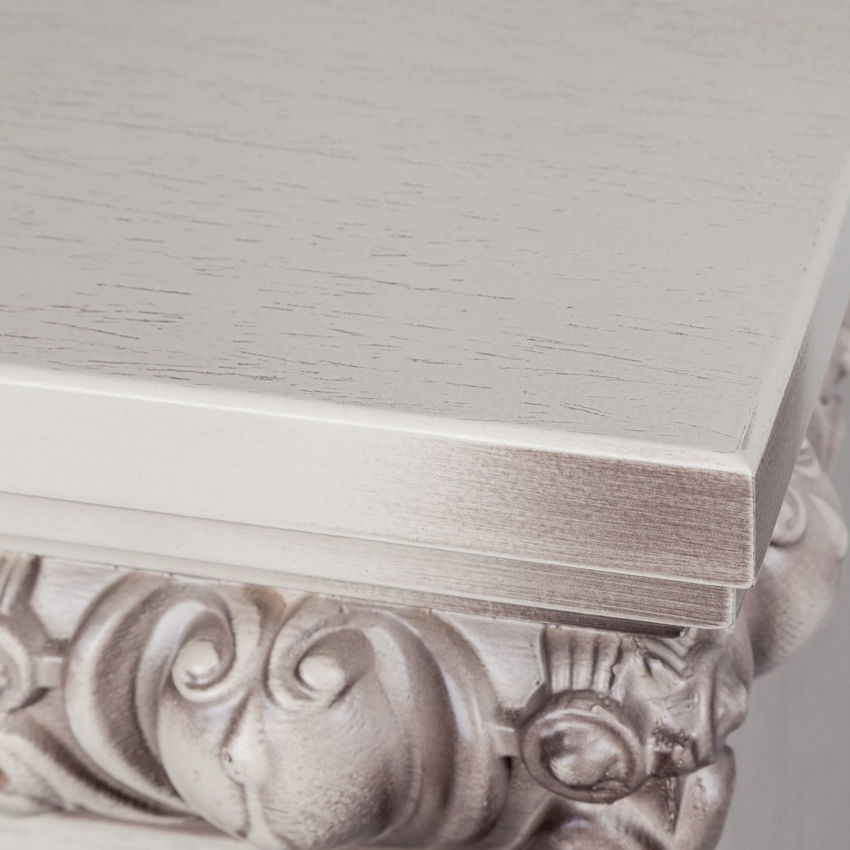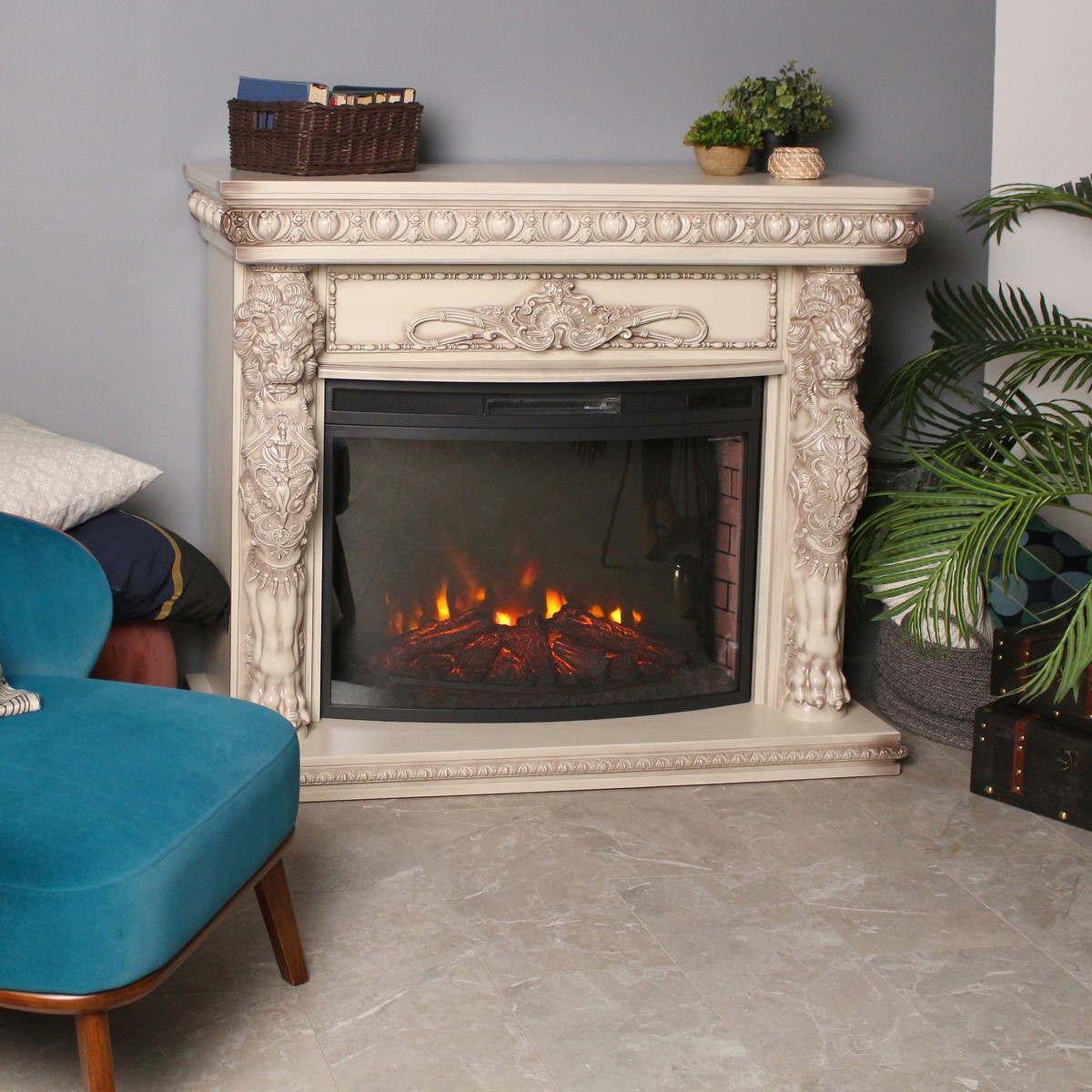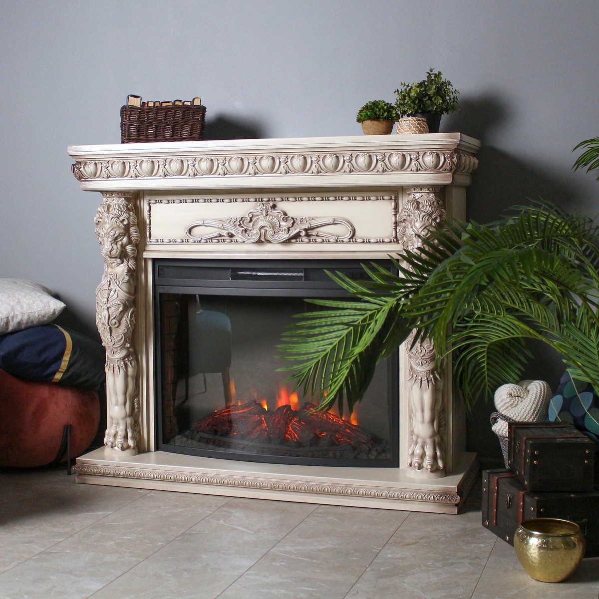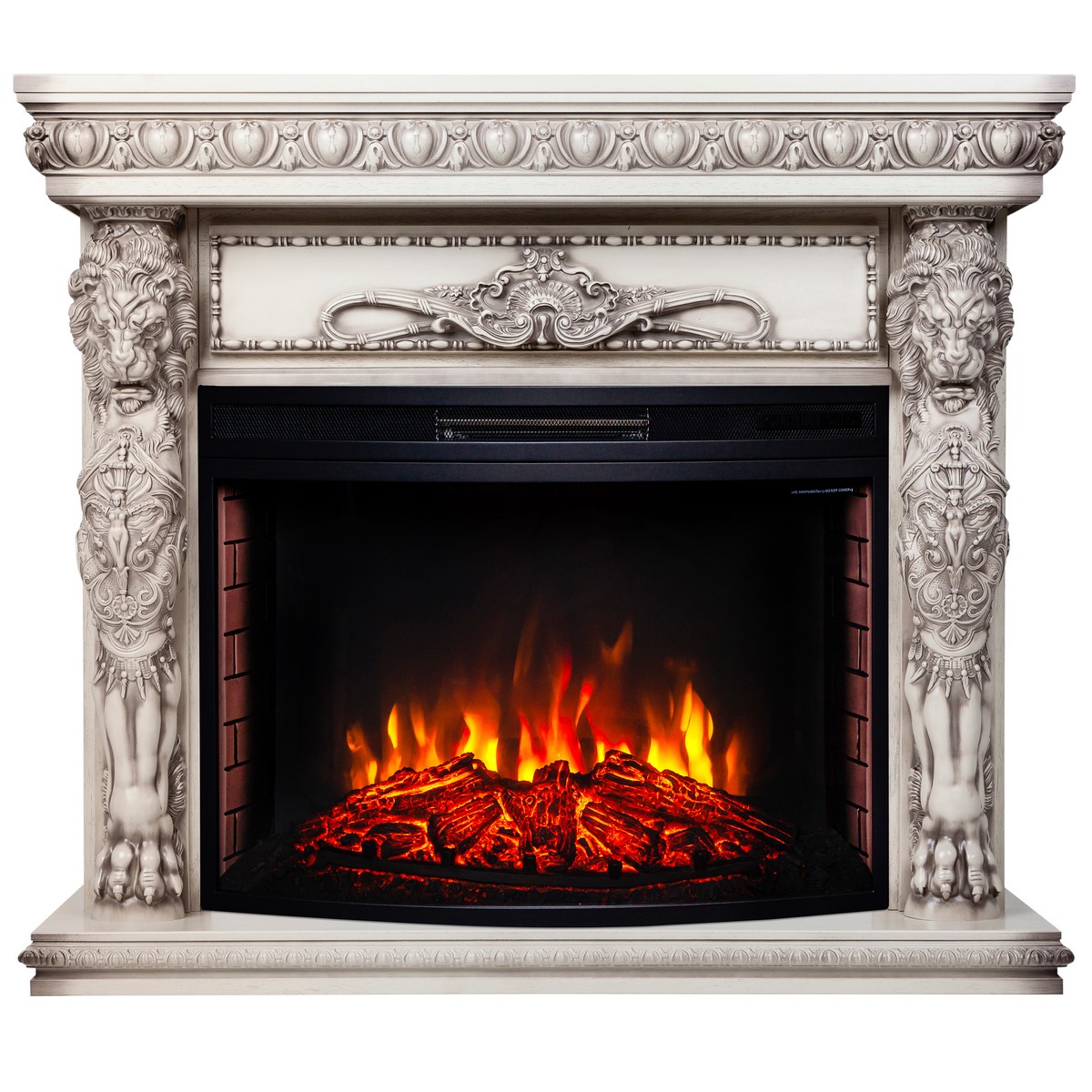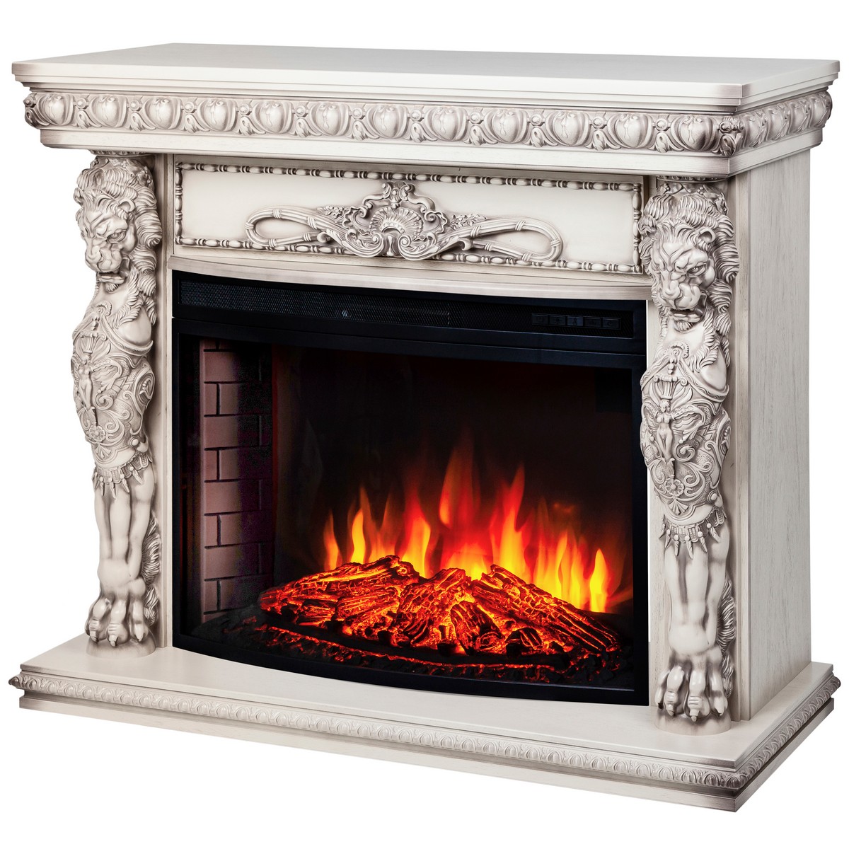 Обрамление из шпонированного МДФ в стиле барокко, в цвете "беленый дуб" WT-655 с очагом Firespace 33 SIR. Очаг с функцией инфракрасного обогрева и пультом управления. Панорамное стекло очага вкупе с реалистичным муляжом дров, гармонируют с эффектным пламенем.