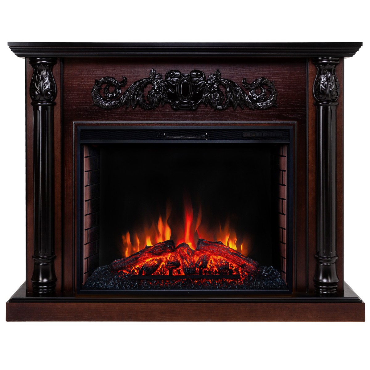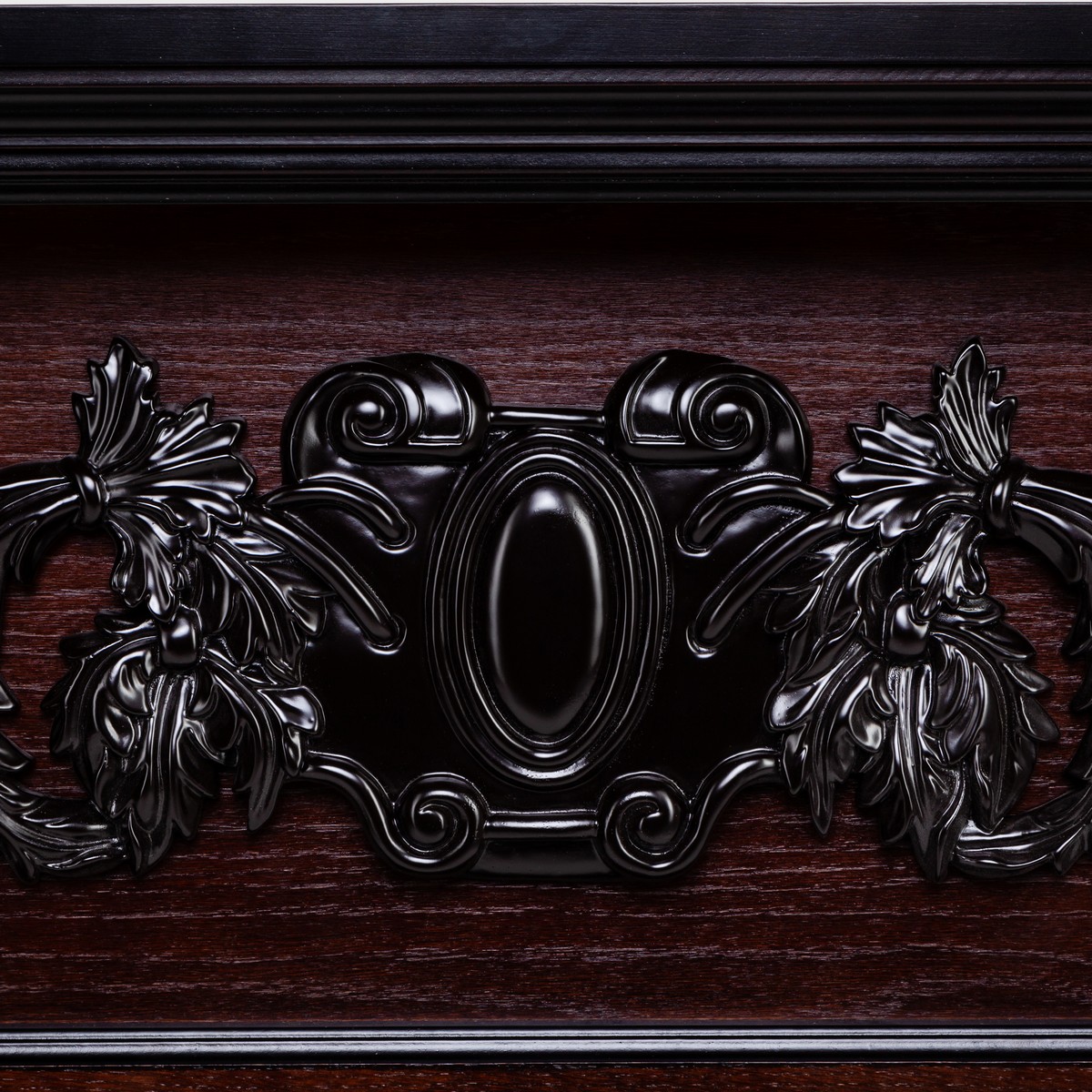 Обрамление SALFORD выглядит классически строго и шикарно. Передняя часть боковых стенок, обрамляющих очаг, оформлена в виде колонн, по поверхности которых протянуты резные каннелюры. Верхняя часть колонн выполнена в форме резных бутонов. На колонны опирается каминная крышка со ступенчатым карнизом. Панель под крышкой оформлена сложным растительным орнаментом. Устанавливается же вся конструкция на невысокое основание.