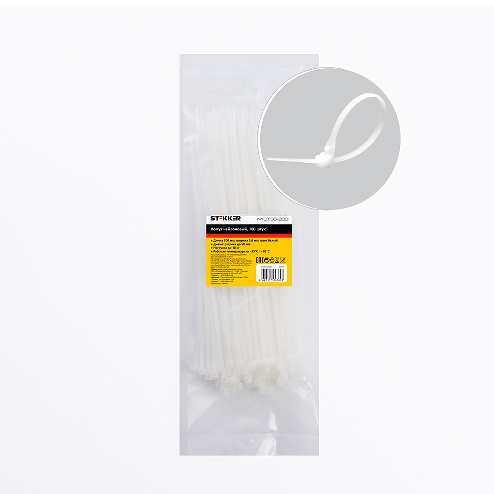 Хомут электромонтажный STEKKER NYCT36-200, одноразовый, белый, материал - нейлон , максимальный диаметр пучка - 50мм, нагрузка - 18кг, диапазон рабочих температур -25°C - +85°C, рекомендуемая температура хранениня +5°C - +25°C