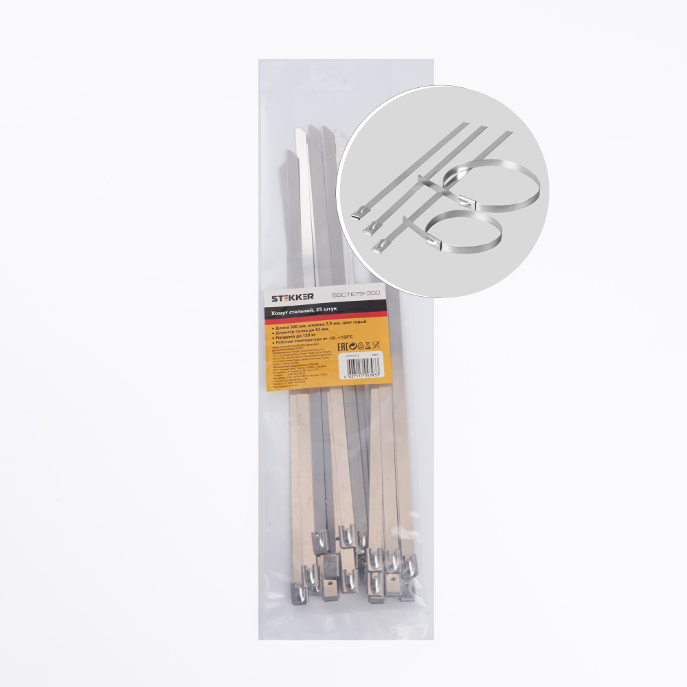 Хомут стальной STEKKER SSCTE79-300 7.9х300мм, d пучка max 82мм, нагрузка 120кг, серый, упаковка 25 шт
