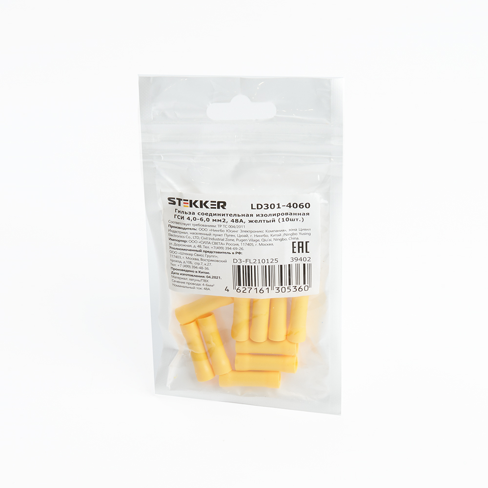 Гильза соединительная изолированная STEKKER LD301-4060 сечение 4,0-6,0 мм2, 48A, желтый (DIY упаковка 10 шт)