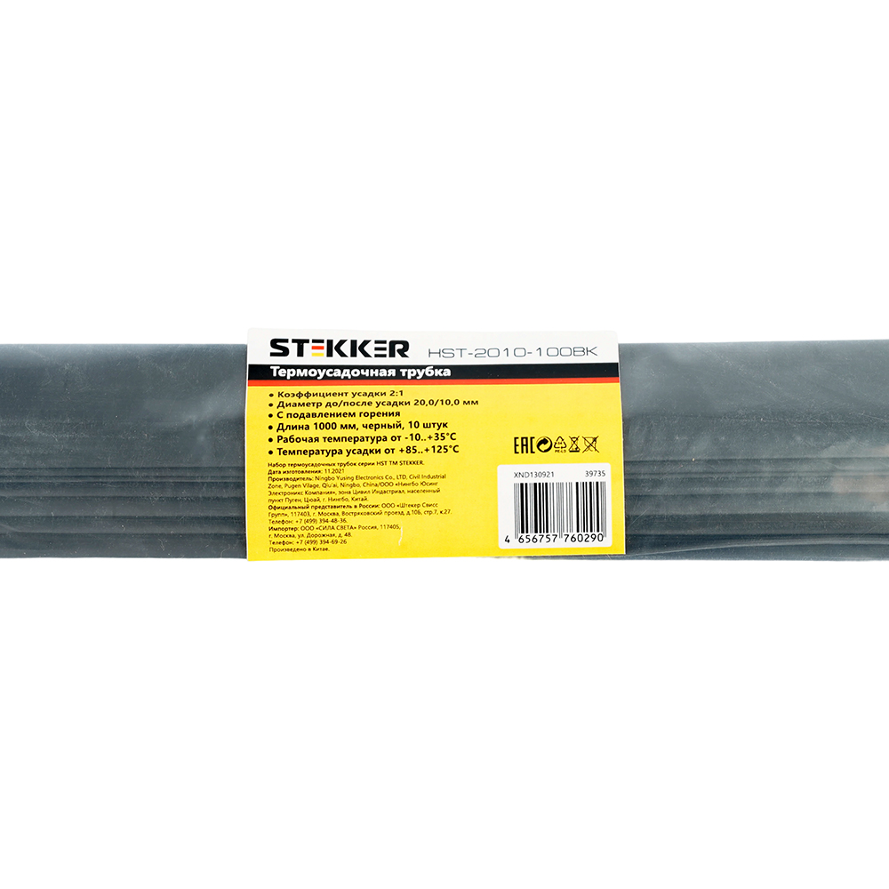 Термоусадочные трубки STEKKER HST-2010-100BK, длина 1000мм. 10шт. в наборе, цвет: черный. Коэффициент усадки 2:1, диапазон рабочих температур -10..+35°C, температура усадки +85..+125°C, номинальный ток 32А, для проводов сечением мм2.