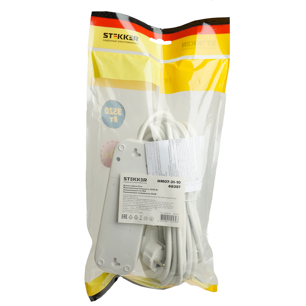 Удлинитель трехместный с/з с выключ. STEKKER HM07-31-10 3x1мм2, 10м, серия Home (У16А-002), белый