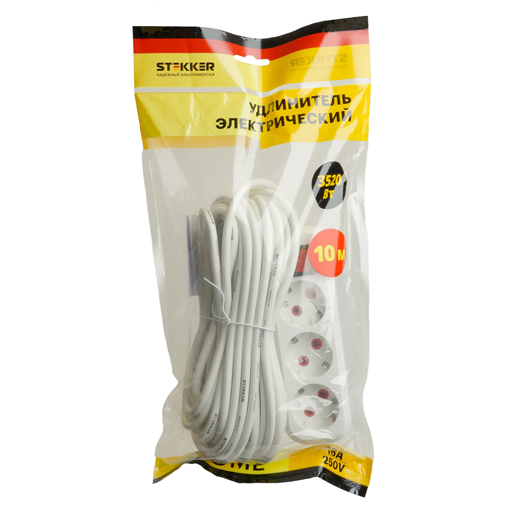 Удлинители STEKKER 49357, серия Home, цвет белый, длина 10 м, количество розеток 3, сталь, сечение кабеля 1 мм2, тип кабеля ПВС, материал кабеля -, ток 16А, напряжение 250В, максимальная нагрузка 3520Вт, тип вилки - прямая. Диапазон рабочих температур +1..+35°C, степень защиты IP20, класс защиты от поражения эл. током 1, размеры изделия 190*55*40. Гарантия 1 год.