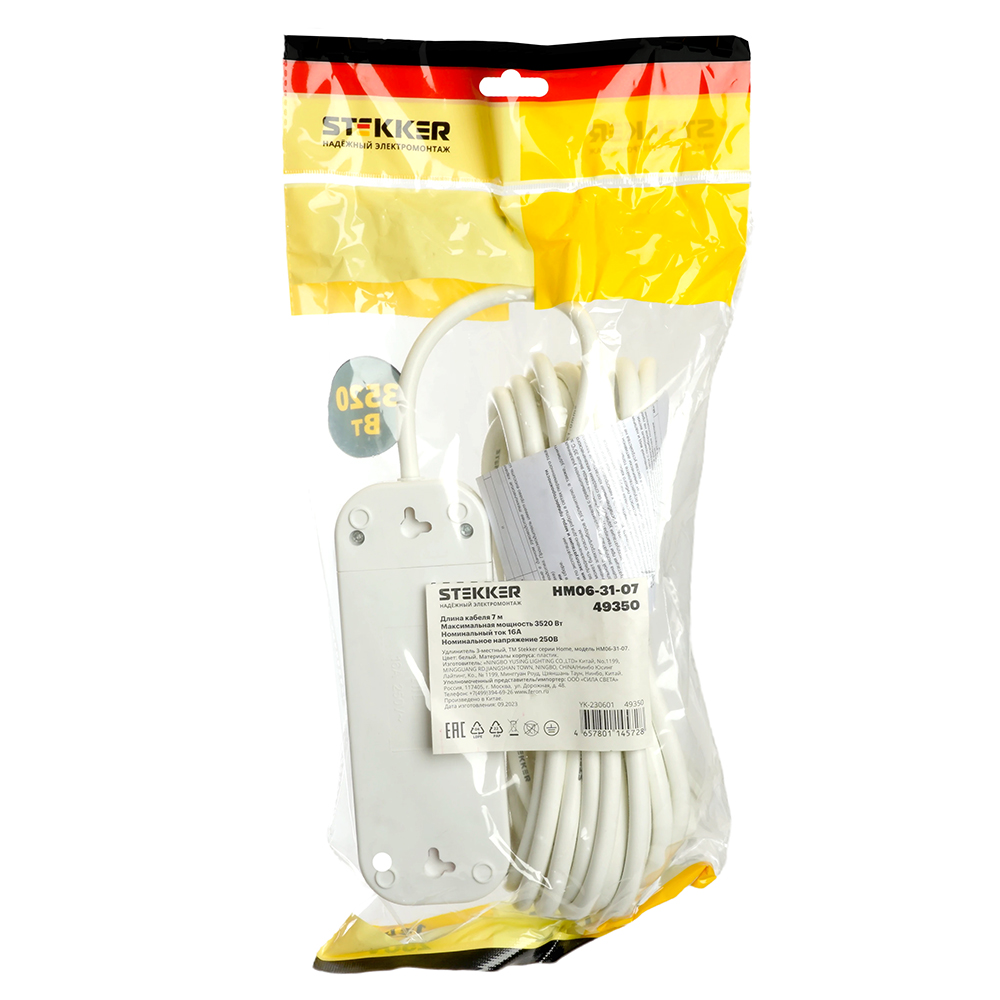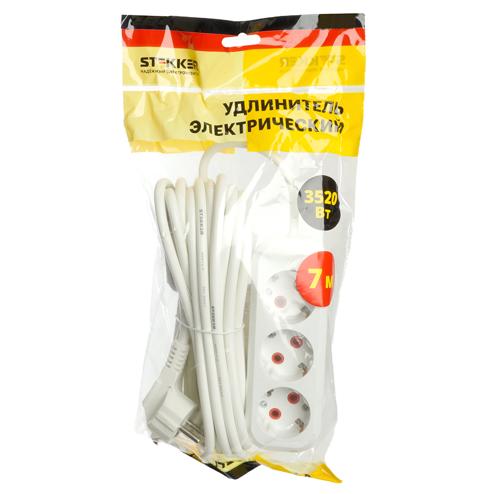 Удлинитель трехместный с/з STEKKER HM06-31-07 3x1мм2, 7м, серия Home (У10-002), белый