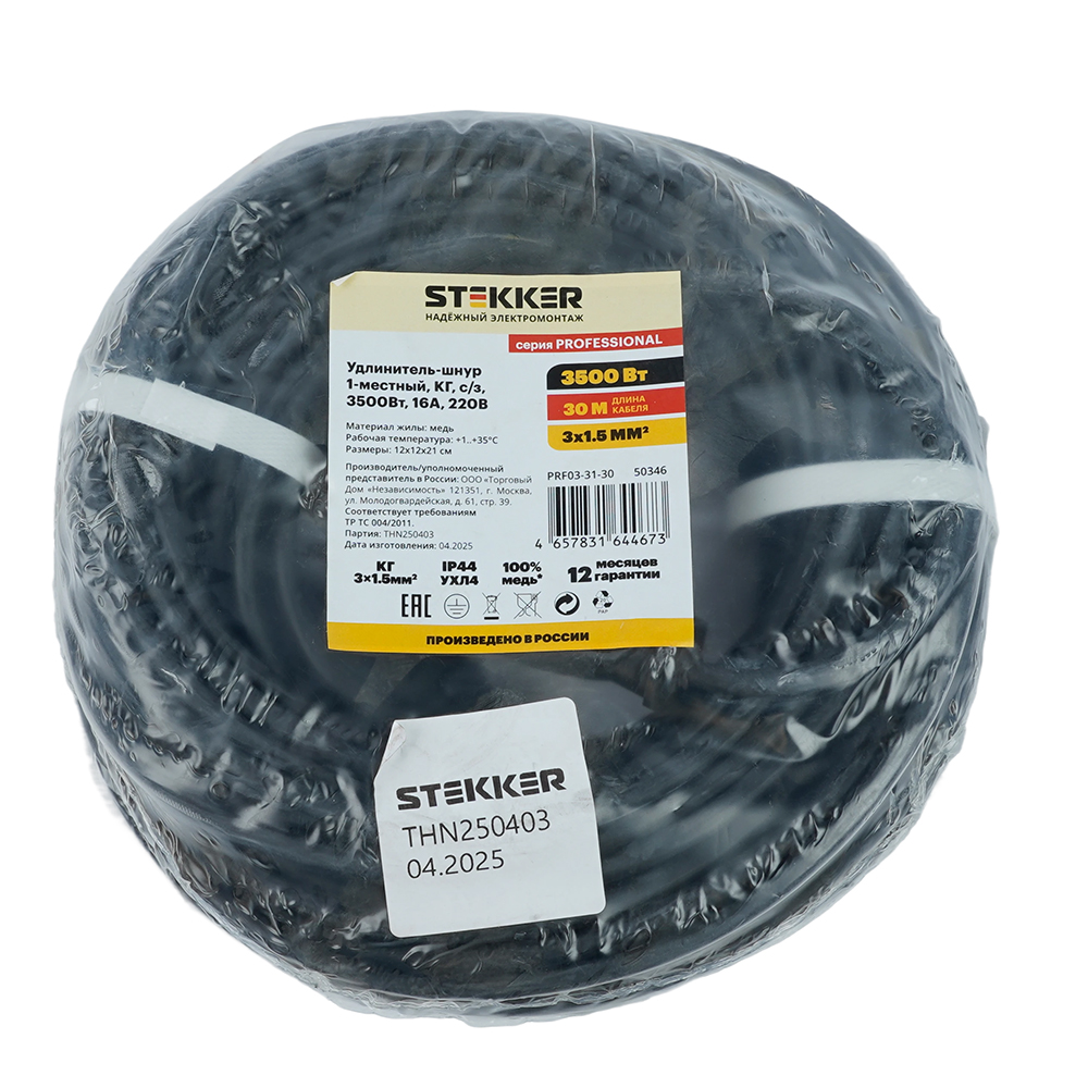 Удлинители STEKKER PRF03-31-30, серия Professional, цвет черный, длина 30 м, количество розеток 1, сталь, сечение кабеля 1.5 мм2, тип кабеля КГ, материал кабеля медь, ток 16А, напряжение 220В, максимальная нагрузка 3500Вт, тип вилки - угловая. Диапазон рабочих температур -60°C - +45°C, степень защиты IP44, класс защиты от поражения эл. током 1, размеры изделия 120*120*210. Гарантия 1 год.