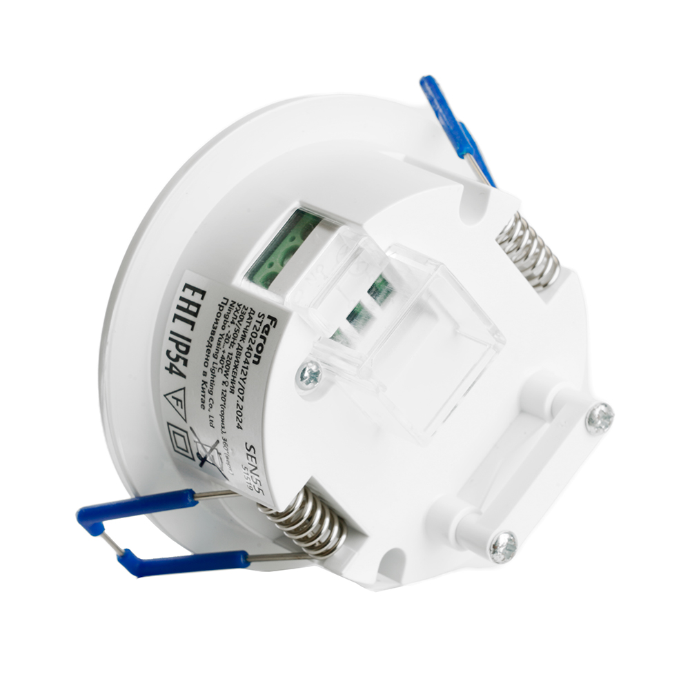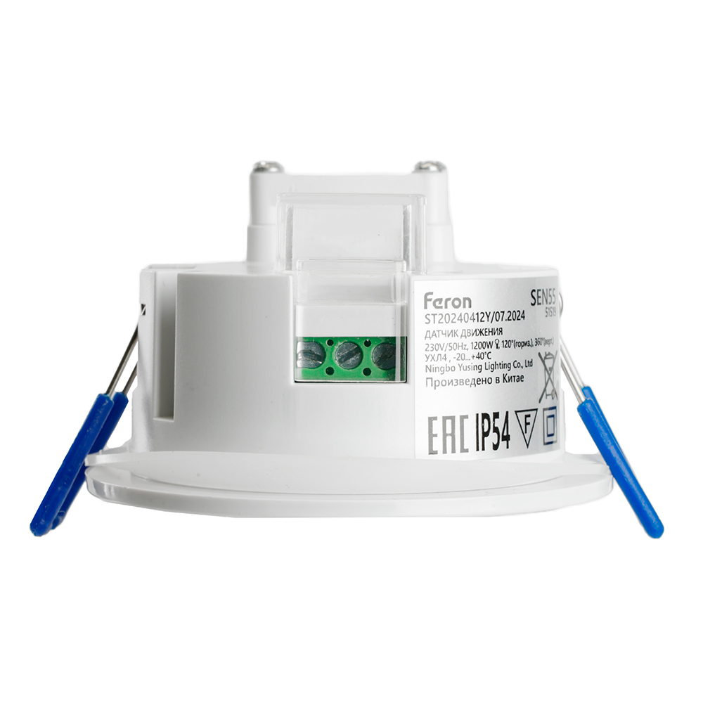 Датчик движения и освещенности FERON SEN55 инфракрасный, встраиваемый, IP54, 230V, 1200, расстояние обнаружения 8м, угол обнаружения 120°(гориз.), 360°(верт.), с регулировкой освещенности и времени задержки, цвет белый, 76*49мм