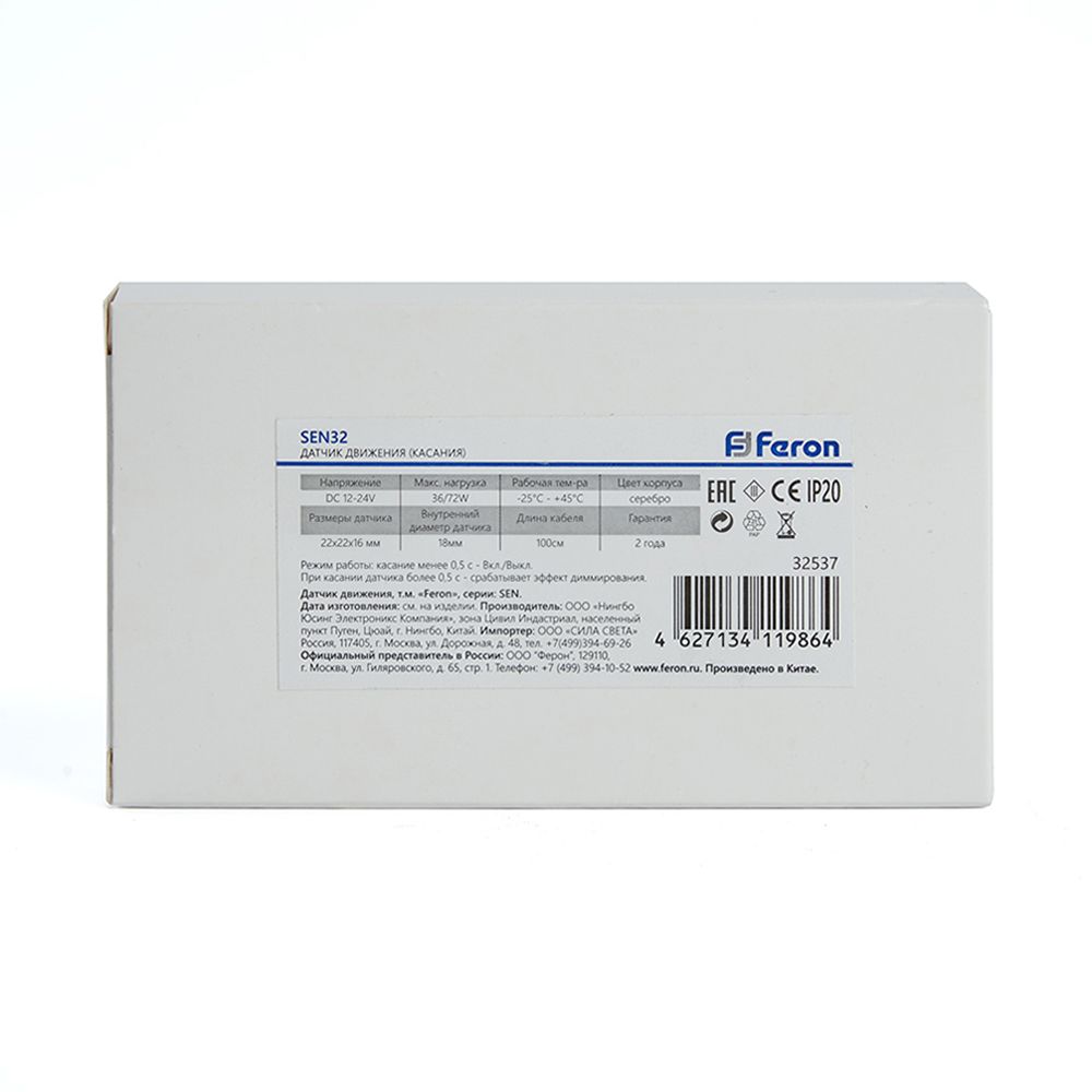Датчик движения FERON SEN32 на касание, встраиваемый, IP20, 12/24V, 36/72W, расстояние обнаружения касание, цвет серебро, 22*22*16мм