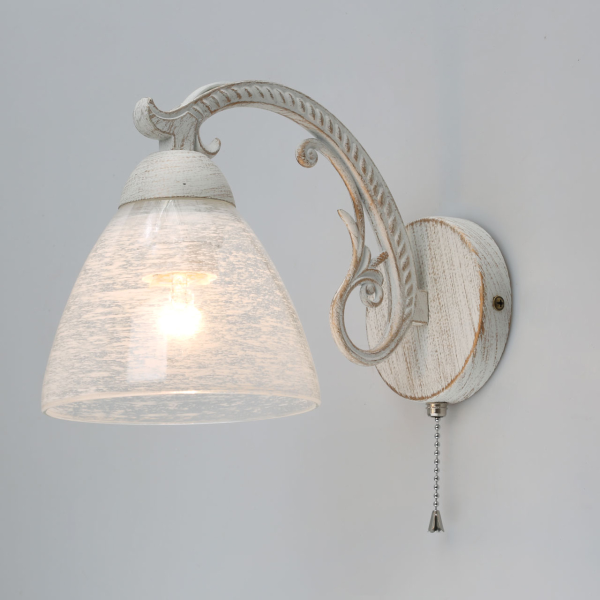 Основание светильника выполнено из комбинации сплавов металлов и обработано по технологии хай-лайт, где основной слой белого цвета, а декоративный слой - золотого. Рожок выполнен из сплава алюминия по технологии художественного литья. На стеклянный плафоны нанесен рисунок белой краской в виде паутинки.