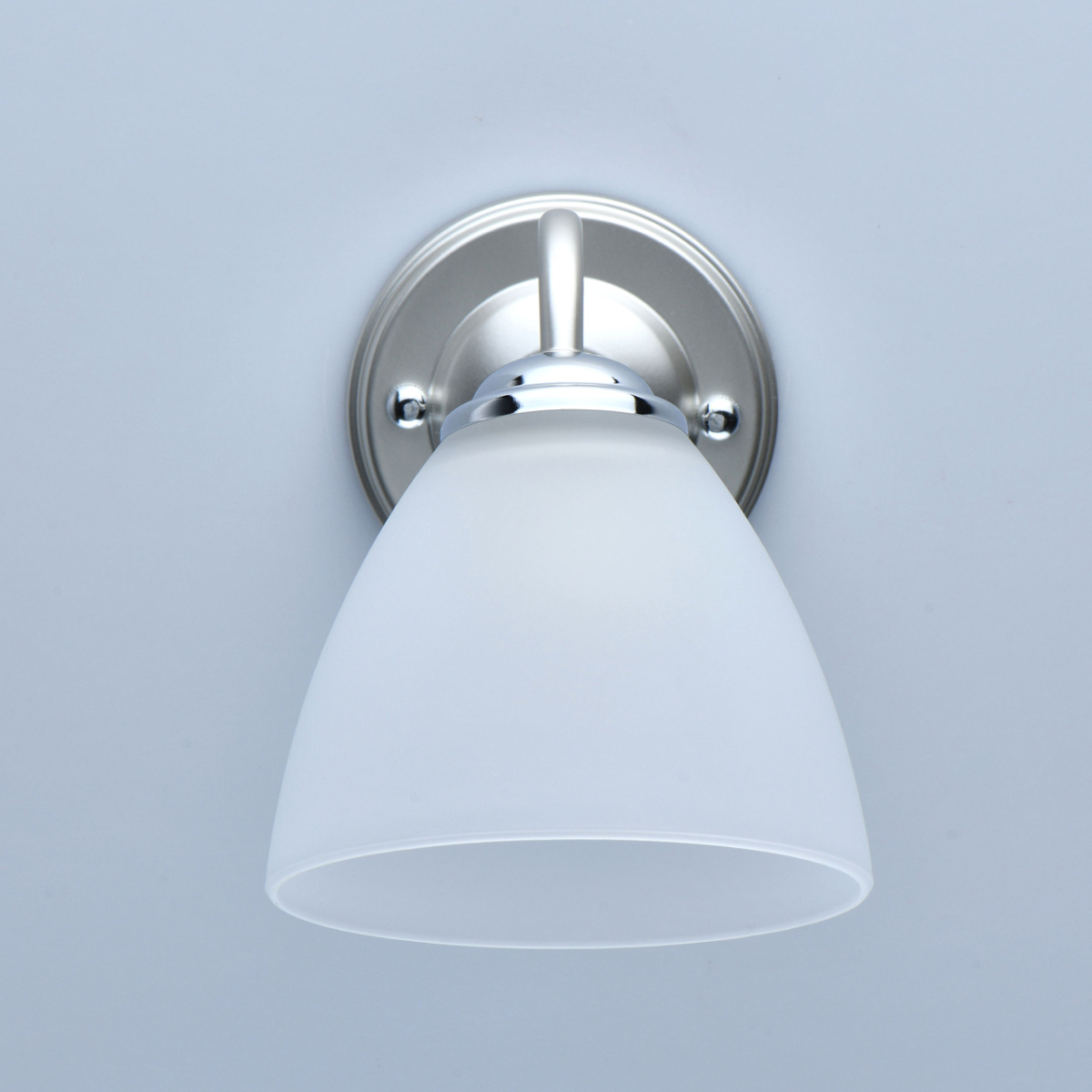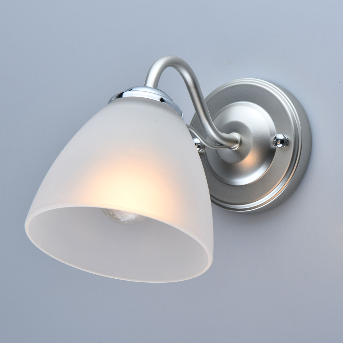 Основание светильника выполнено из сплава металла и окрашено в цвет перламутрового серебра. Отдельные элементы основания гальванизированы в цвет хрома. Светильник декорирован стеклянным матированным плафоном и прозрачным хрусталем.