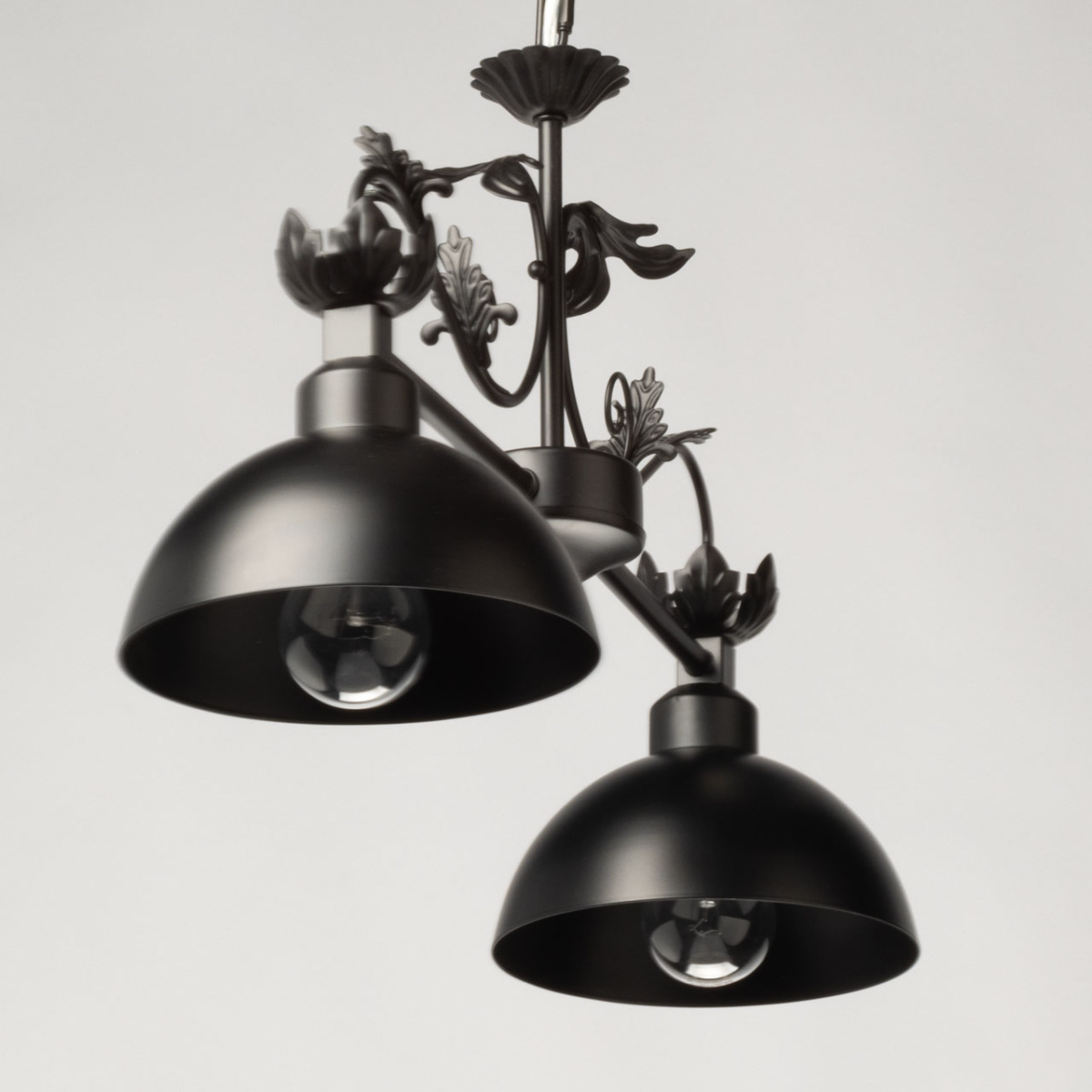 Металлический подвесной светильник идеально подойдет для освещения загородного дома в английском стиле или апартаментов в стиле лофт. Два плафона из металла, окрашенного в черный цвет, закреплены на фигурном кованом основании. В качестве подвеса служит цепь, что позволяет регулировать высоту светильника. Люстра создаст романтическую атмосферу уютным вечером у камина, подойдет для оформления кабинета или библиотеки.