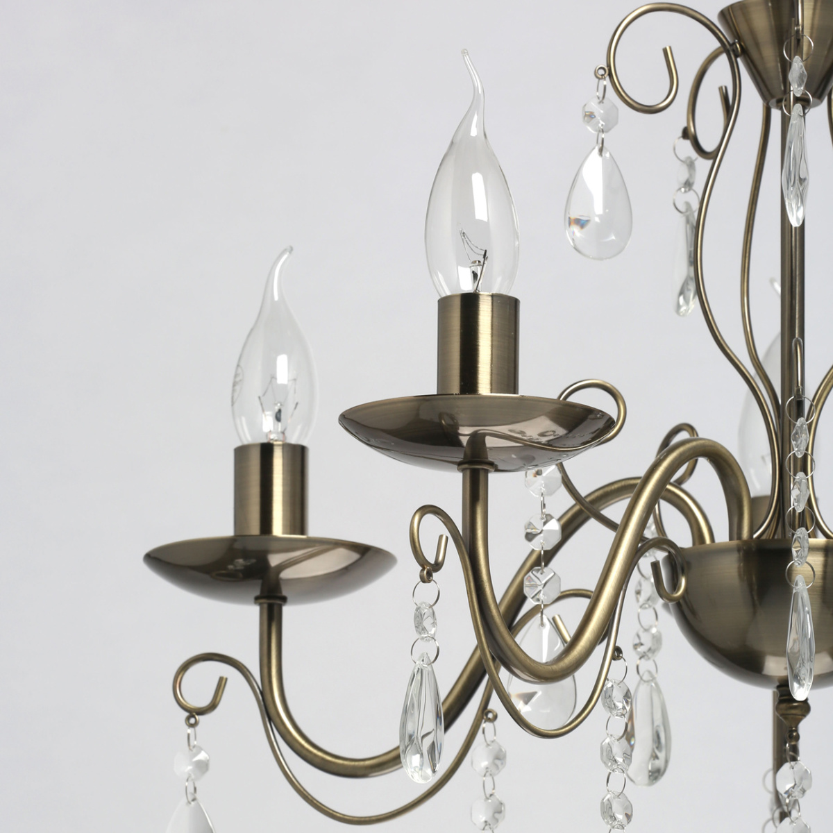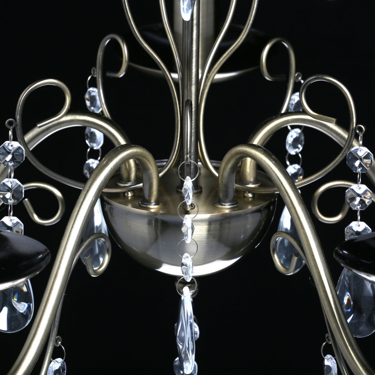 Основание светильника выполнено из металла и гальванизировано в цвет античной бронзы. Светильник декорирован прозрачным хрусталем.