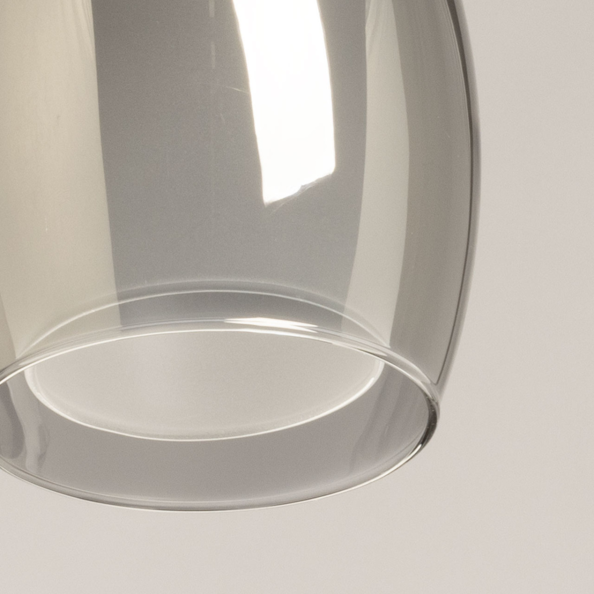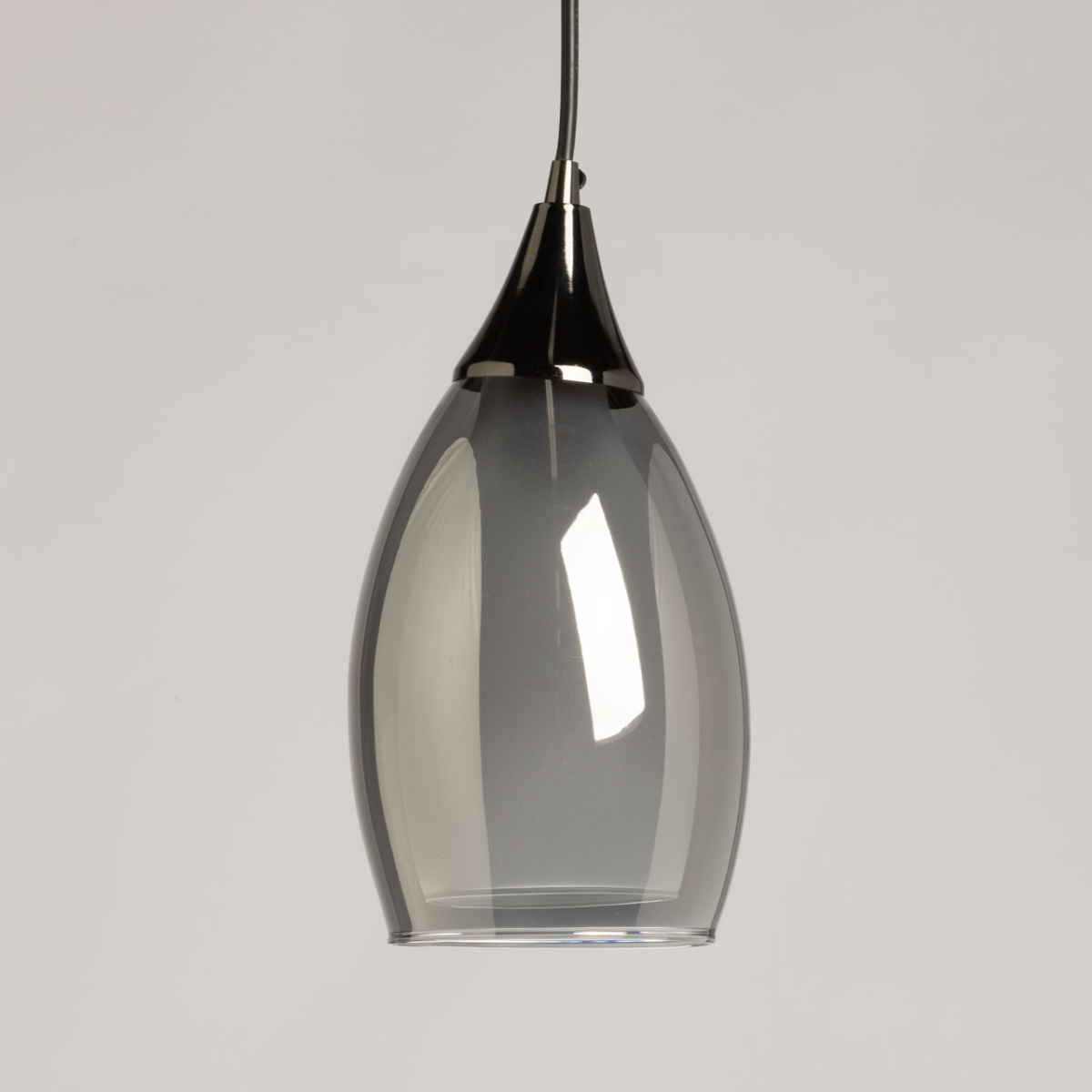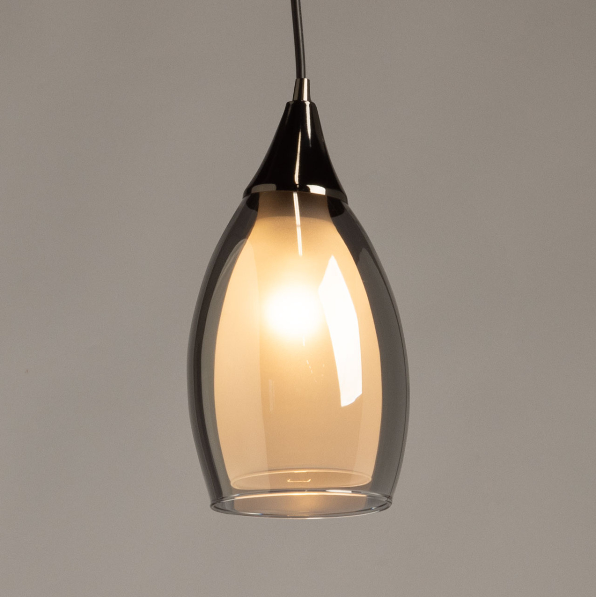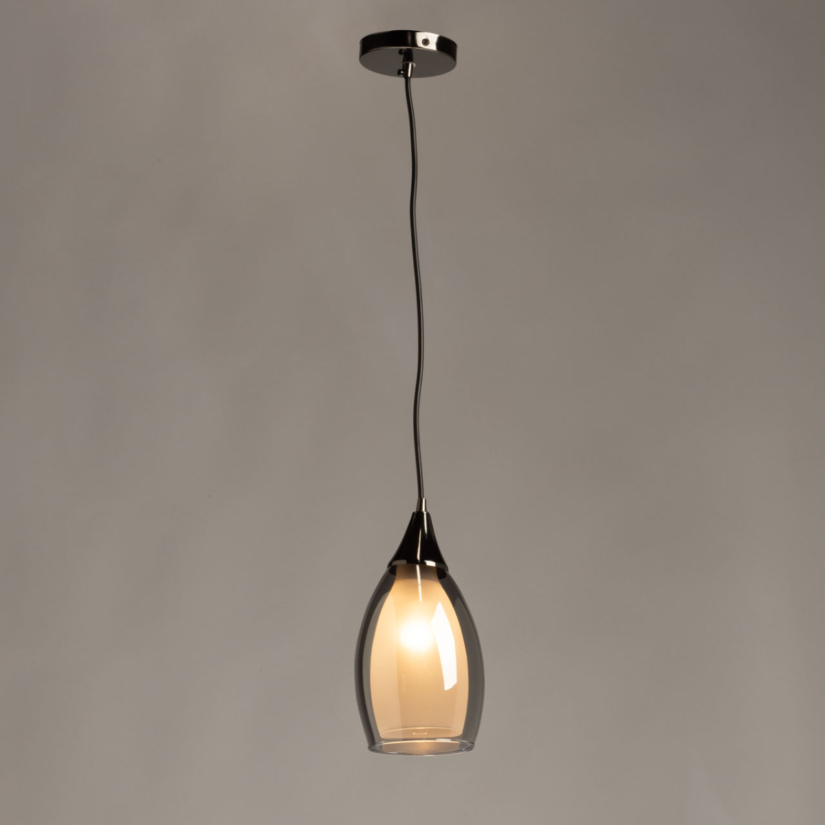 Металлическое основание подвеса гальванизировано в жемчужно-черный цвет. Традиционный источник света закрыт двумя стеклянными плафонами: внутренний - белого цвета, наружный - гальванизирован в дымчатый цвет.