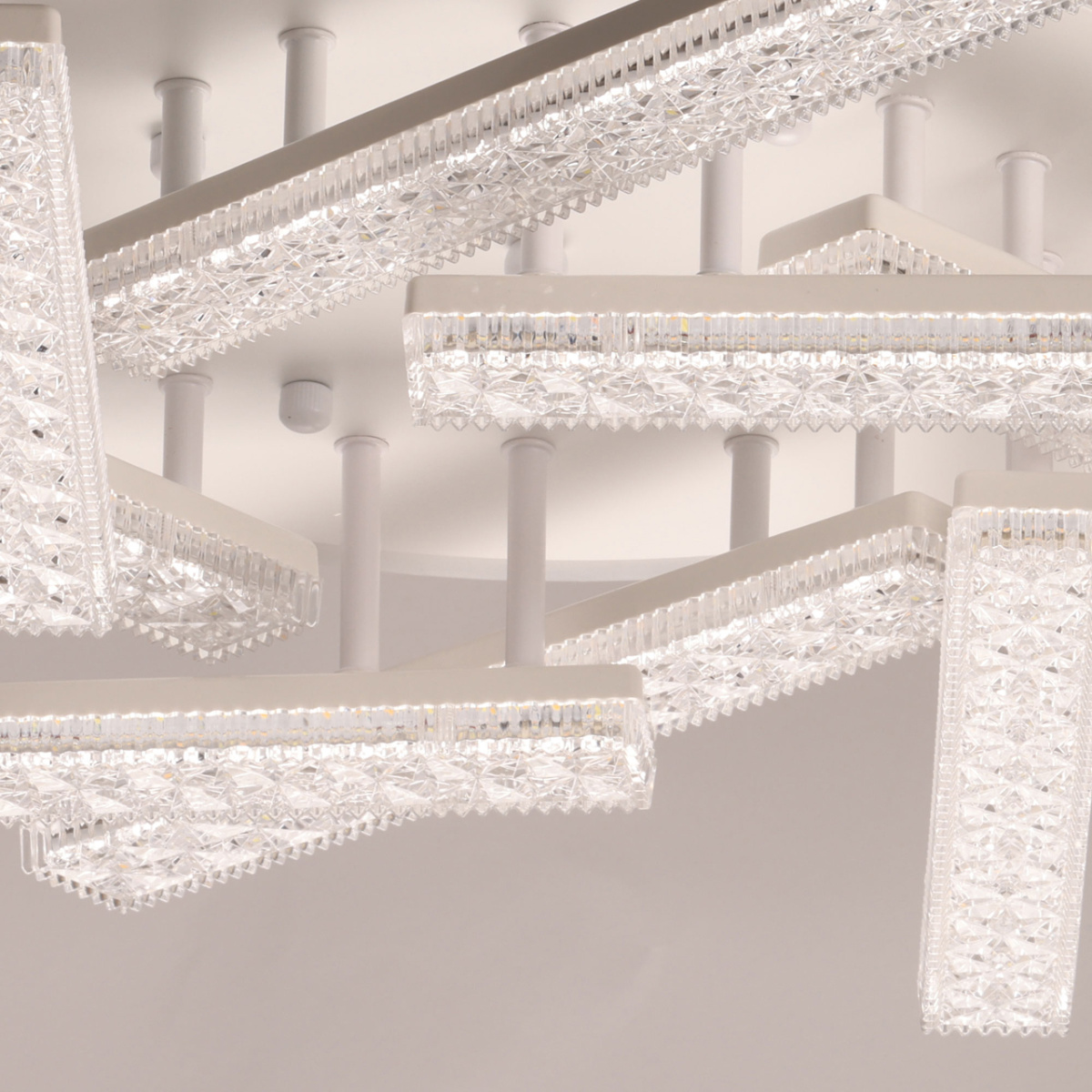 Металлическое основание потолочной люстры окрашено в белый цвет. Светодиодные источники света у потолочной чаши закрыты белым матовым акрилом, на рожках - прозрачным фактурным акрилом.