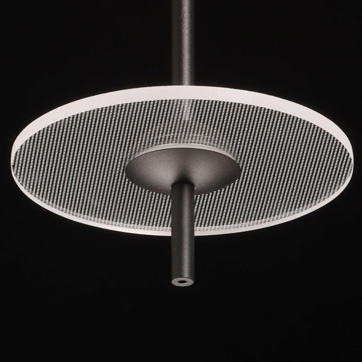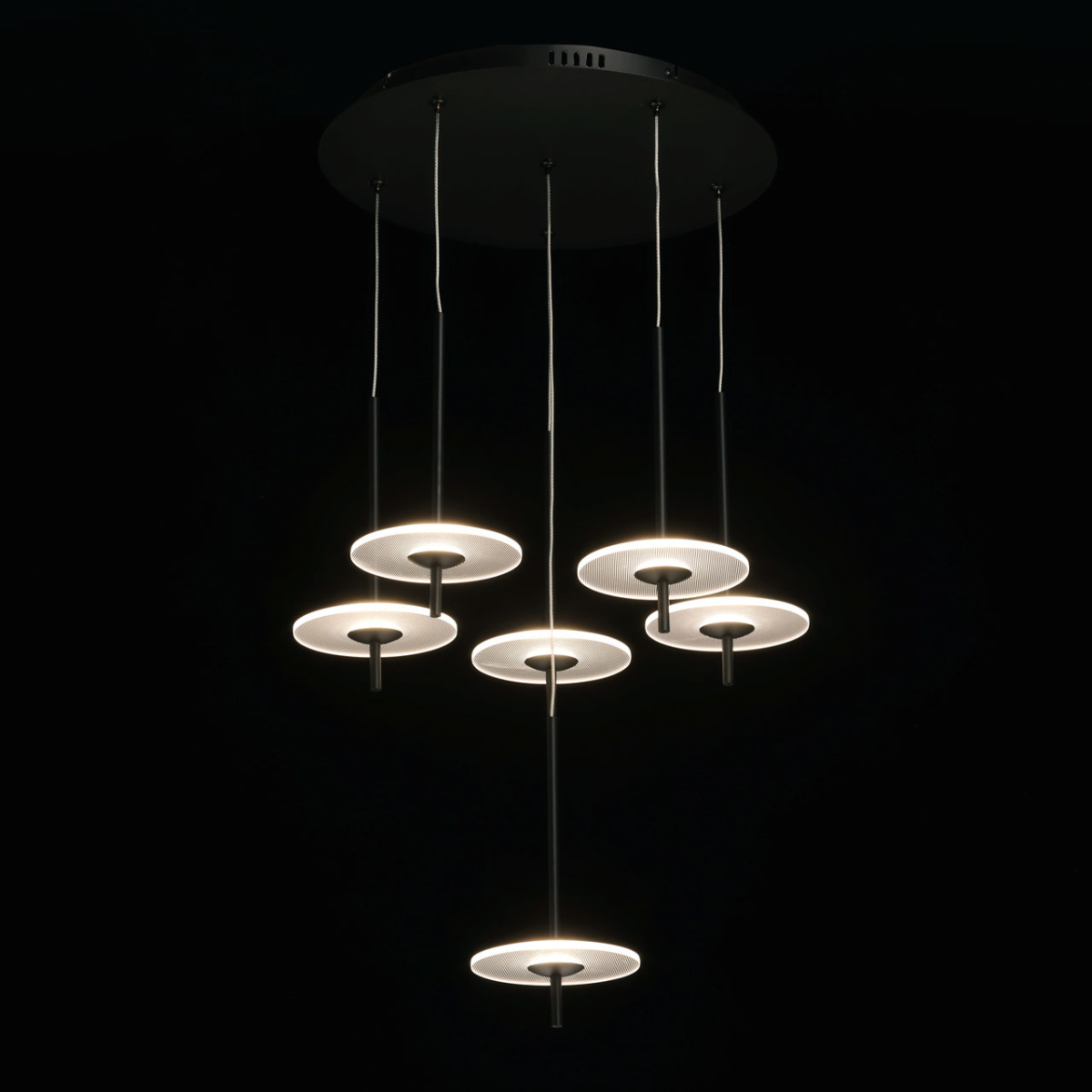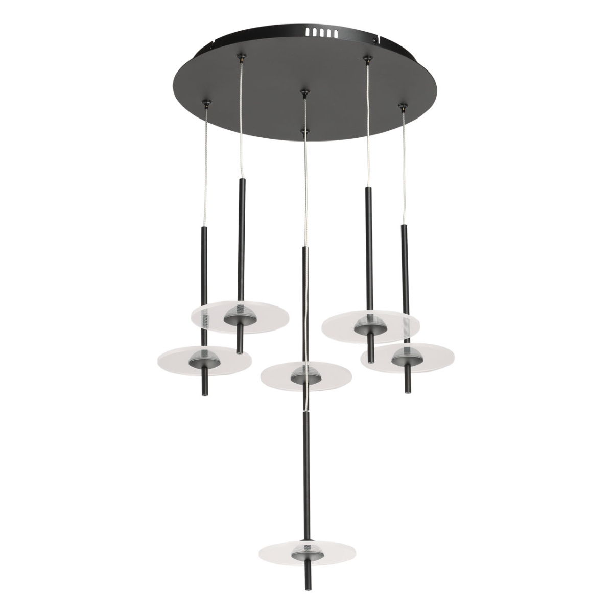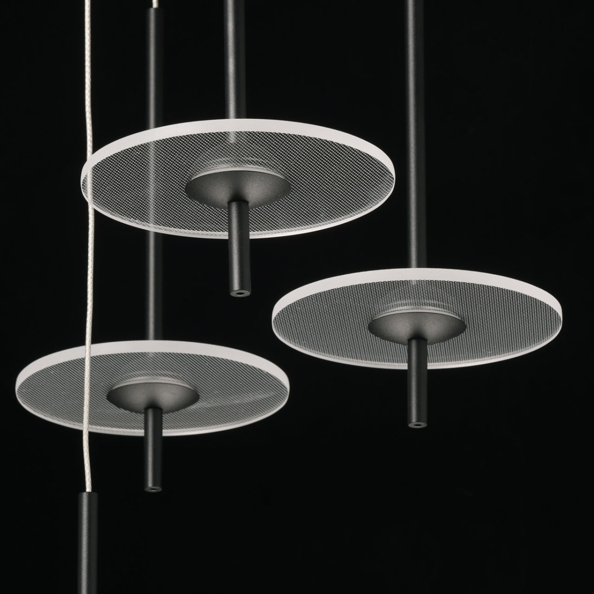 Металлическое основание подвеса обработано по технологии порошкового окрашивания в черный цвет. Плафоны в виде диска выполнены из прозрачного акрила.