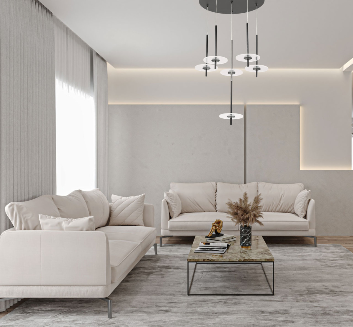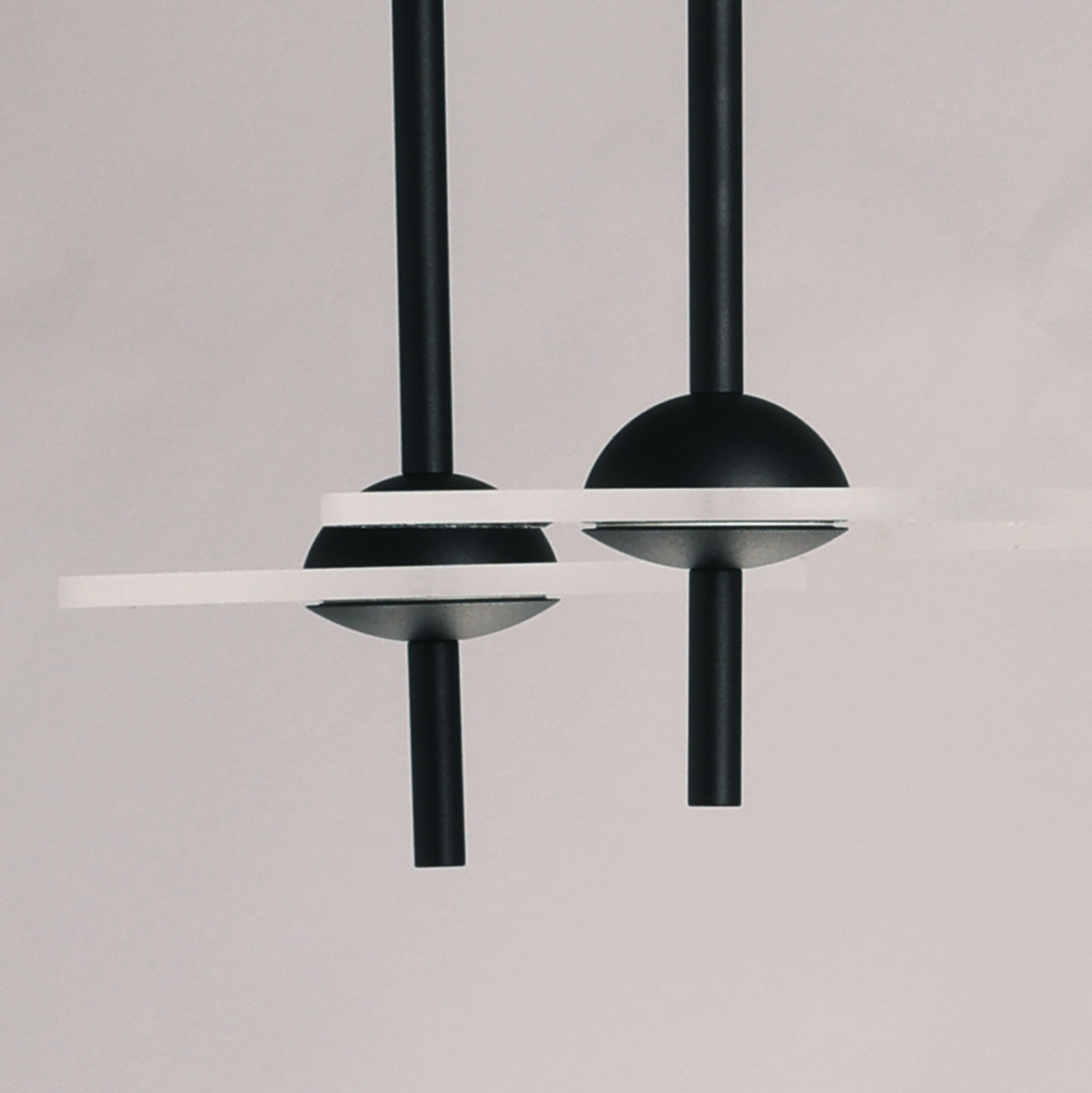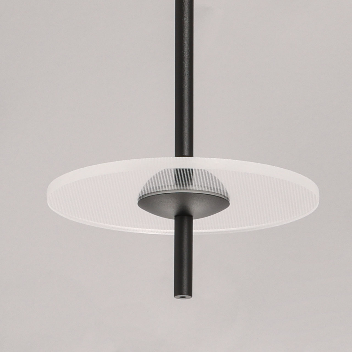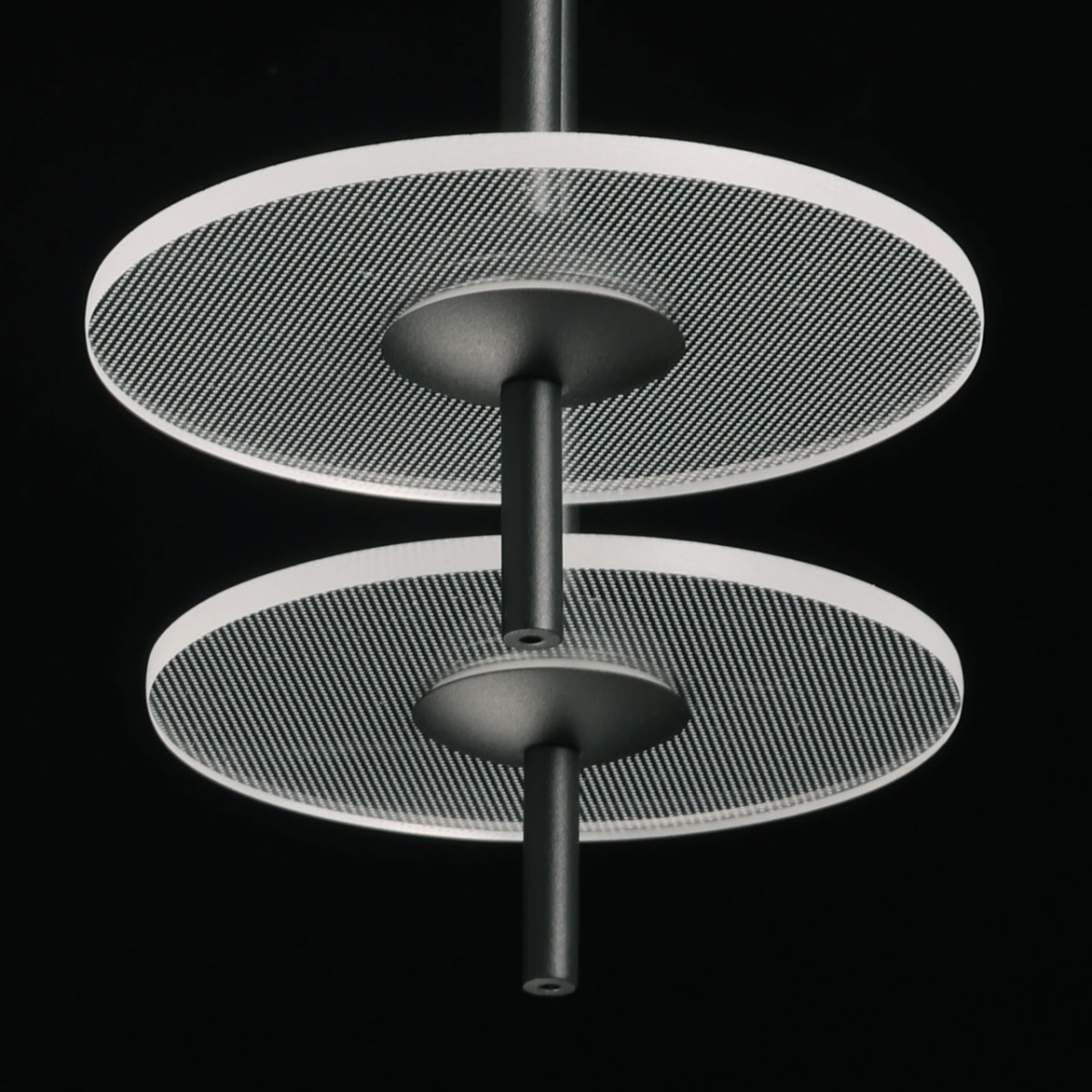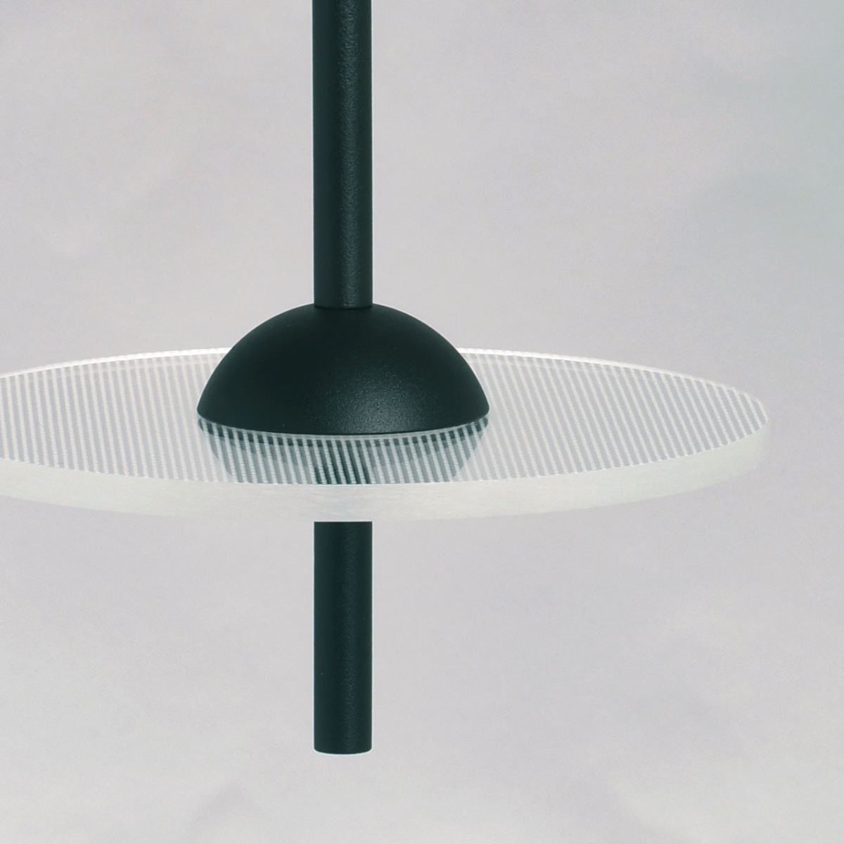 Металлическое основание подвеса обработано по технологии порошкового окрашивания в черный цвет. Плафоны в виде диска выполнены из прозрачного акрила.