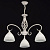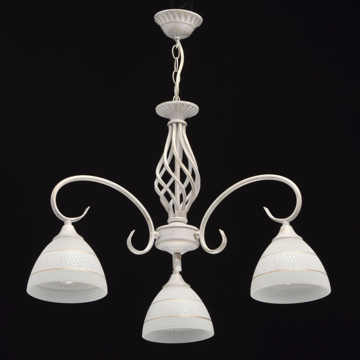Основание: металл, окрашивание по технологии хай-лайт, защитный слой - белый цвет, декоративный слой золотого цвета нанесен сухой кистью . Плафоны: стекло, обработано по технологии матирования. На плафоны нанесен рисунок белой и золотой краской. Декор: центральная часть выполнена по технологии твист.