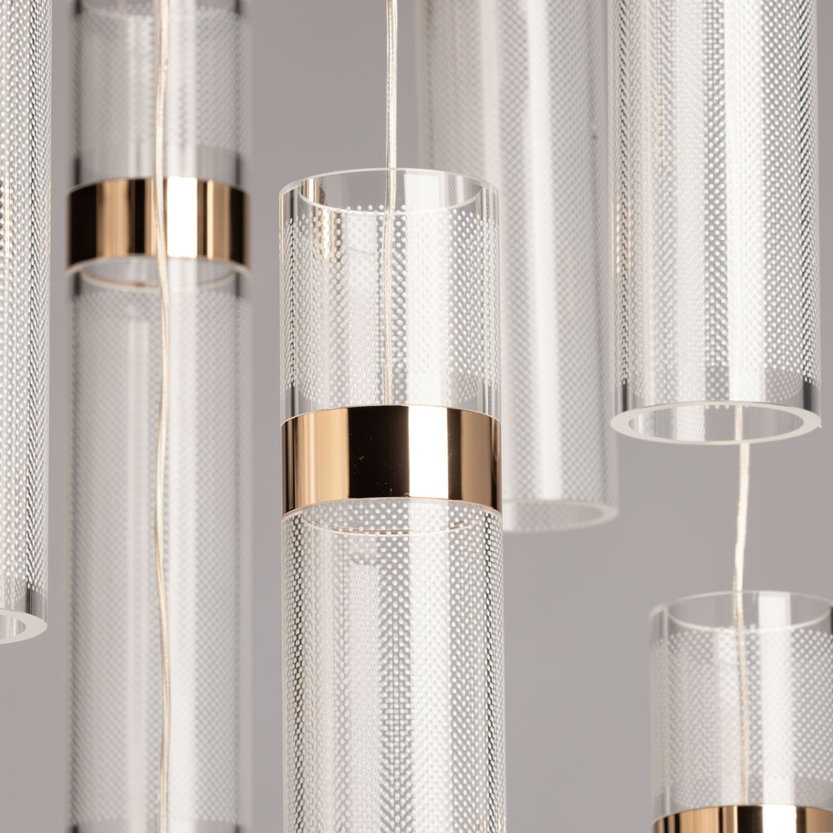 Металлическое основание светильника гальванизировано в цвет золота. Светодиодные источники света закрыты полупрозрачными акриловыми плафонами.
