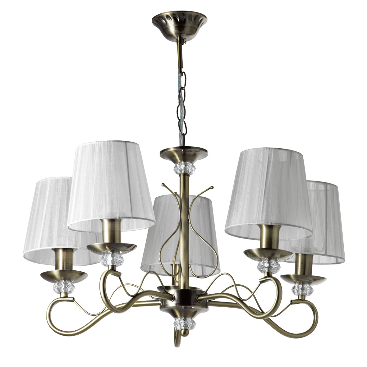 Основание светильника выполнено из металла и гальванизировано в цвет античной бронзы с последующим лакированием. Источники света закрыты текстильными абажурами белого цвета. Светильник декорирован элементами из прозрачного акрила.