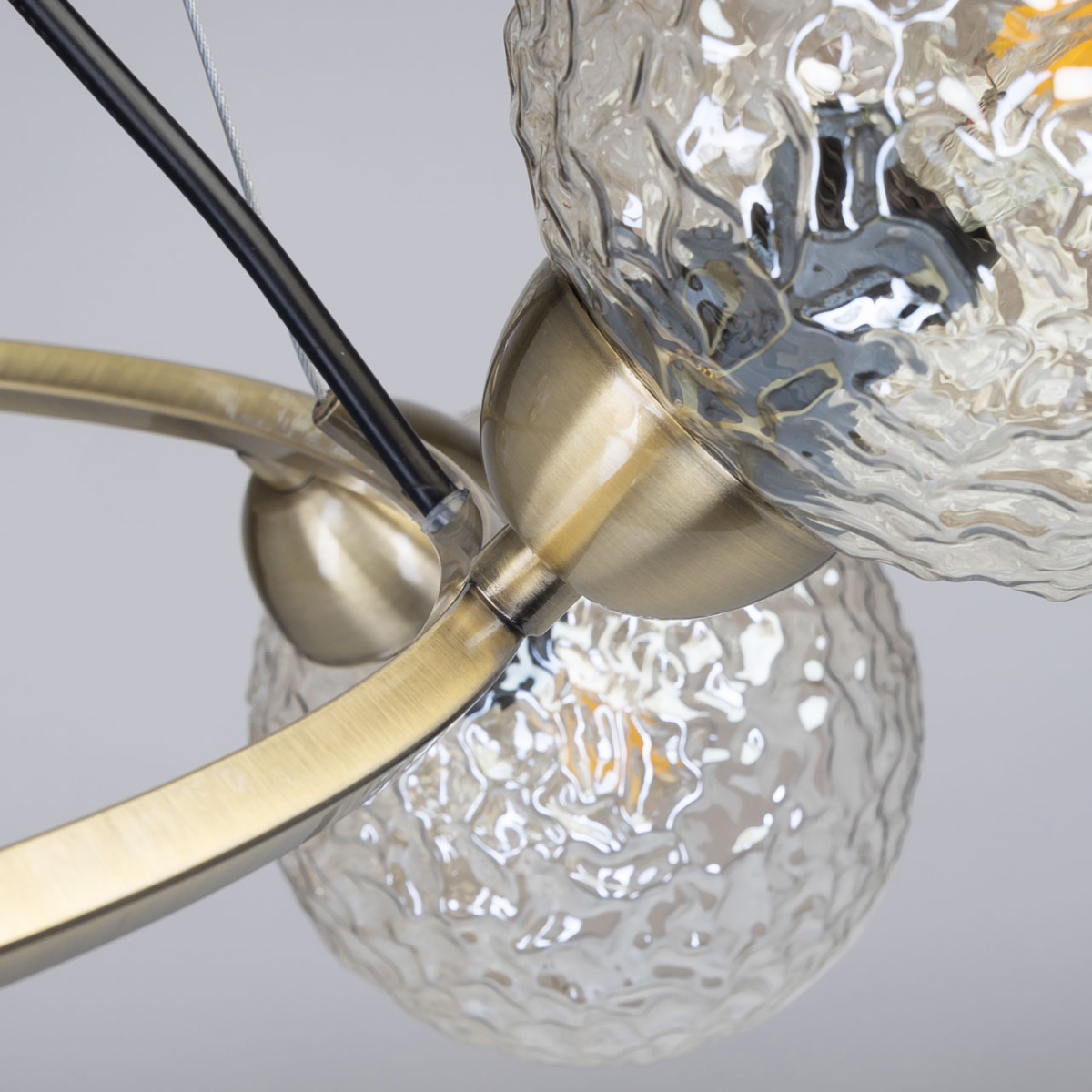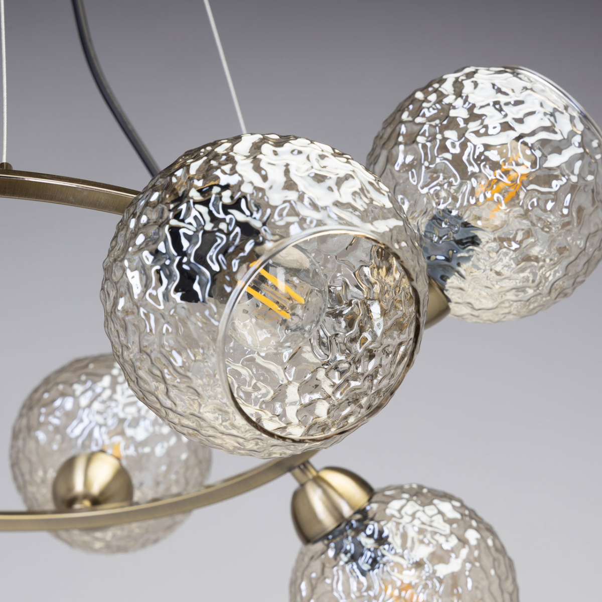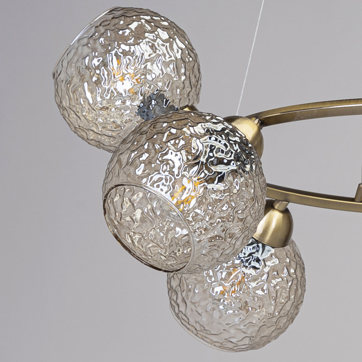 Металлическое основание подвесной люстры гальванизировано в цвет античной бронзы. Светильник декорирован фактурными стеклянными плафонами цвета шампань.