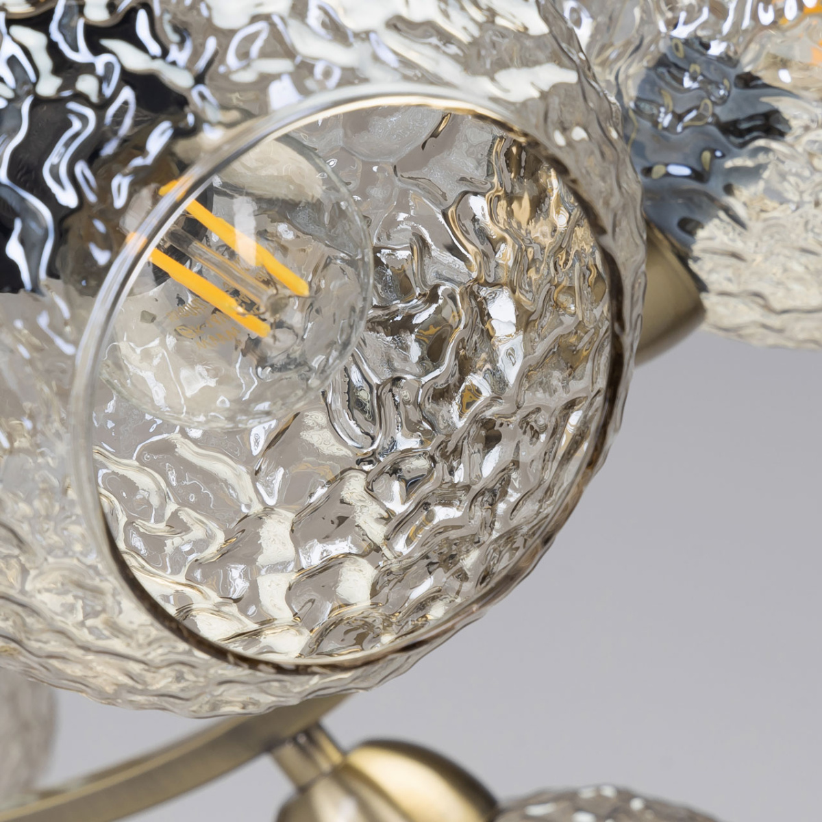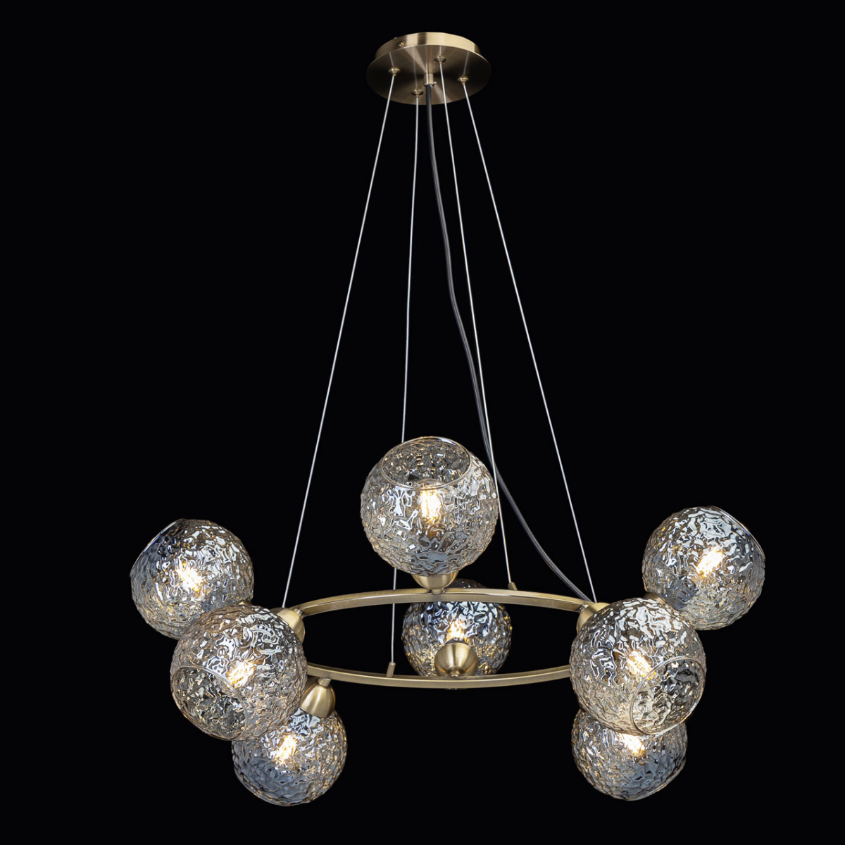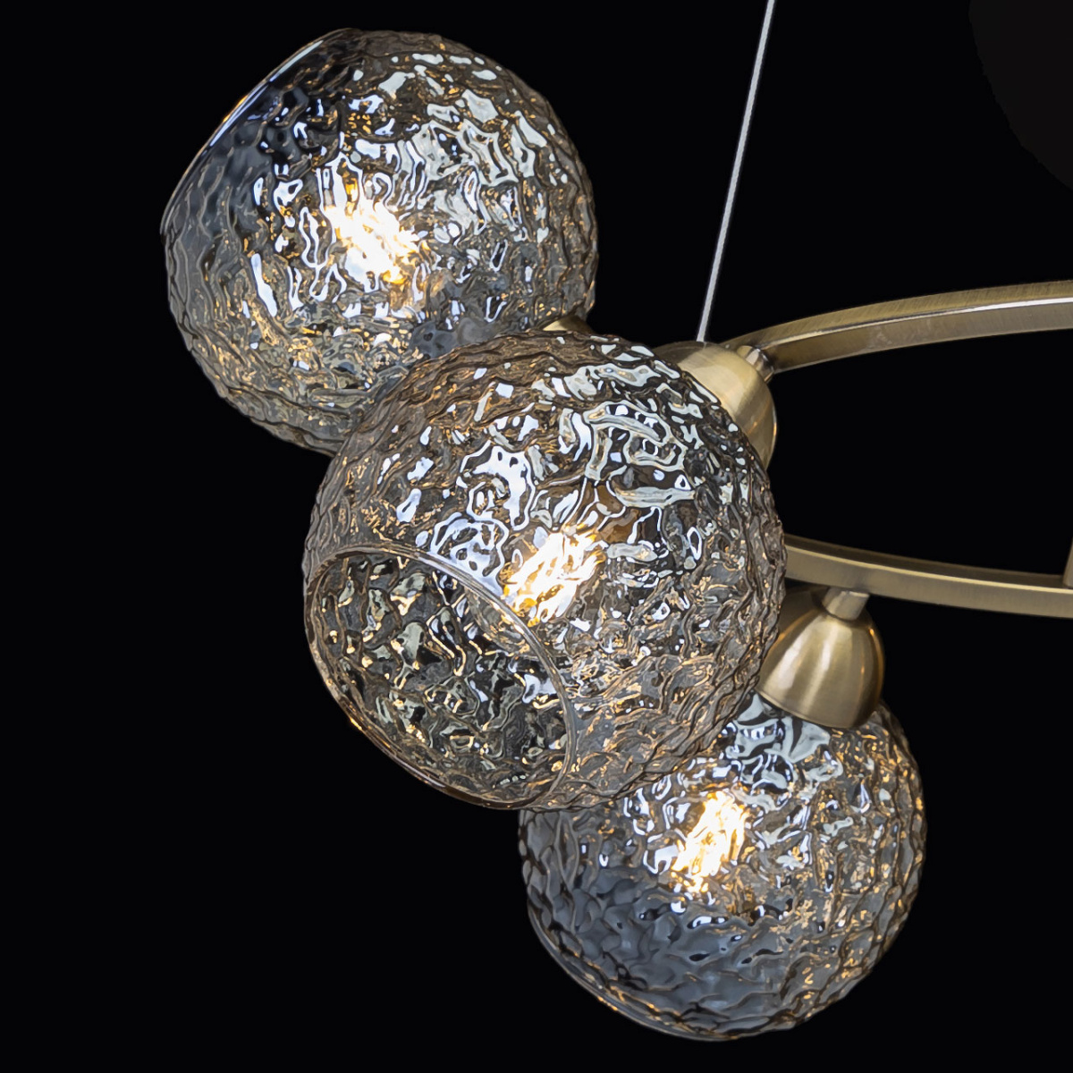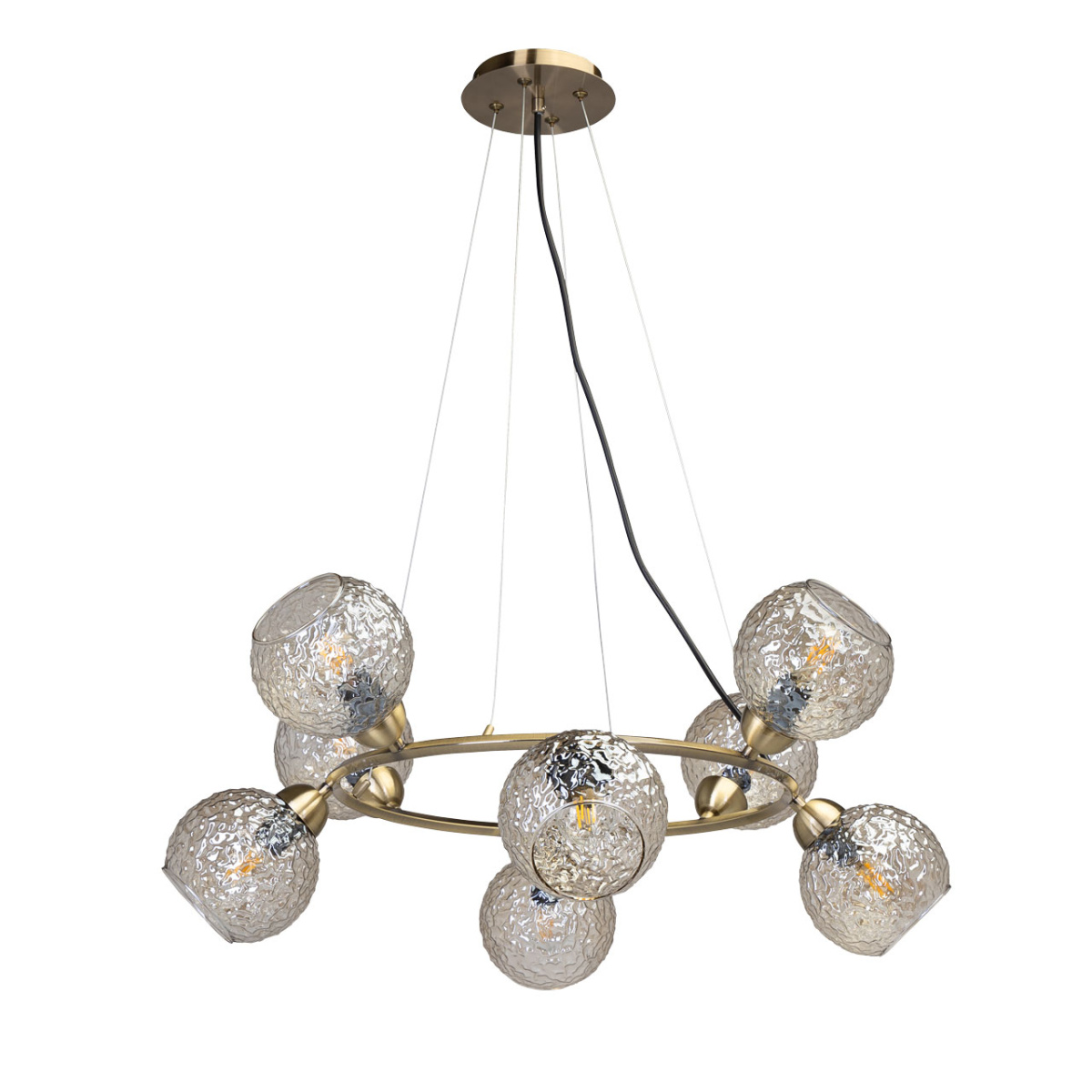 Металлическое основание подвесной люстры гальванизировано в цвет античной бронзы. Светильник декорирован фактурными стеклянными плафонами цвета шампань.
