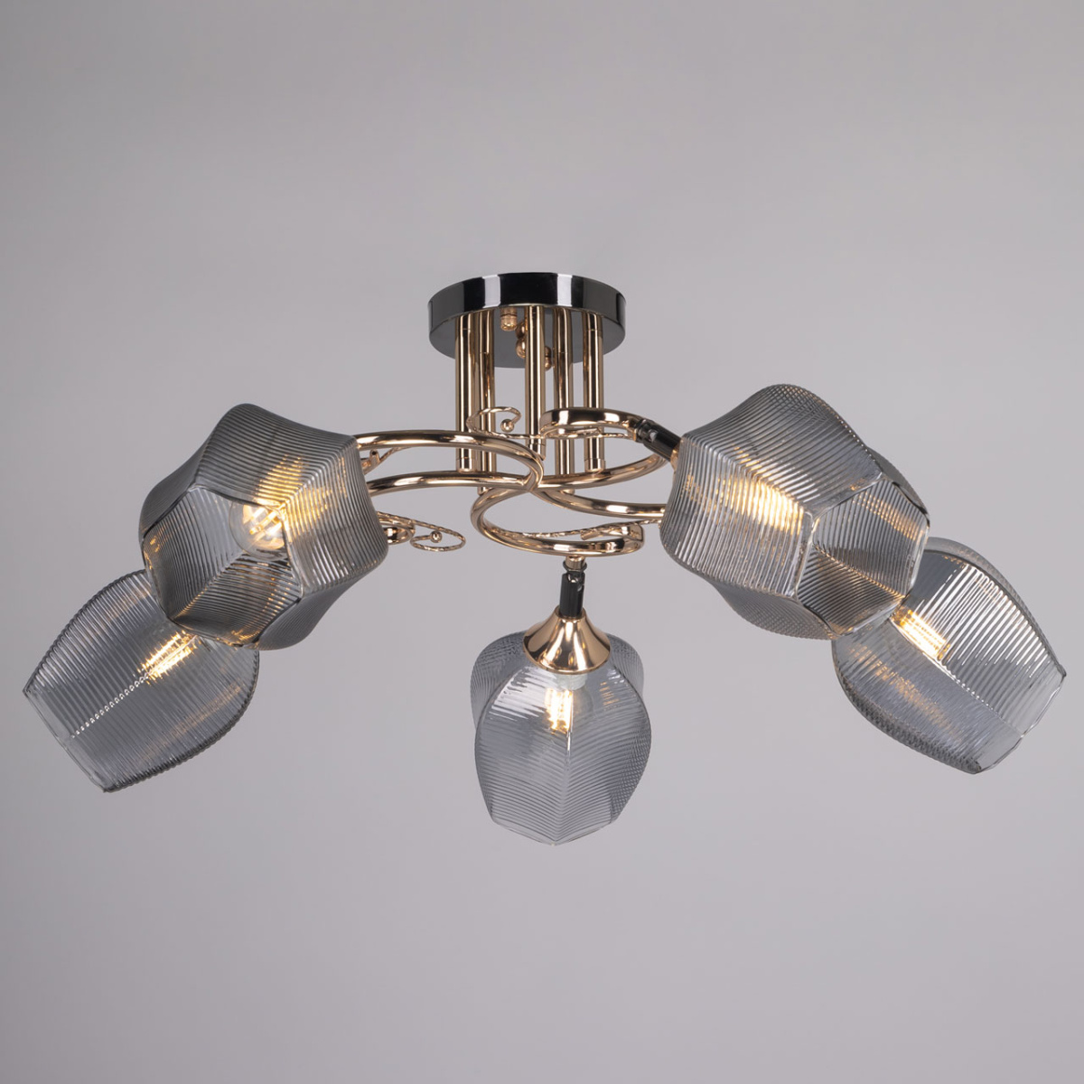 Металлическое основание потолочной люстры гальванизировано в цвет золота. Отдельные элементы основания гальванизированы в цвет черного хрома. Потолочная люстра декорирована стеклянными плафонами сложной формы, гальванизированными в дымчатый металлизированный цвет.