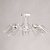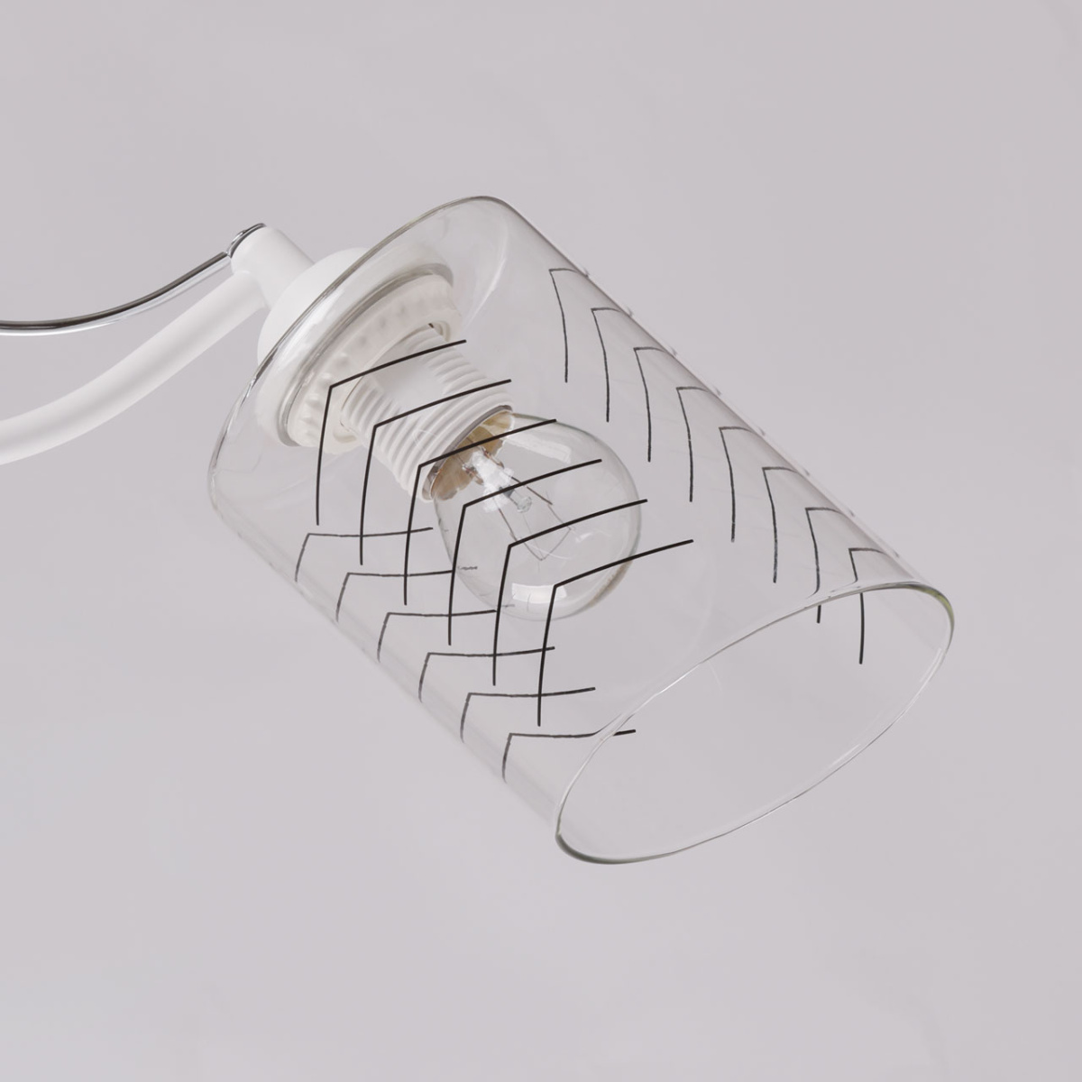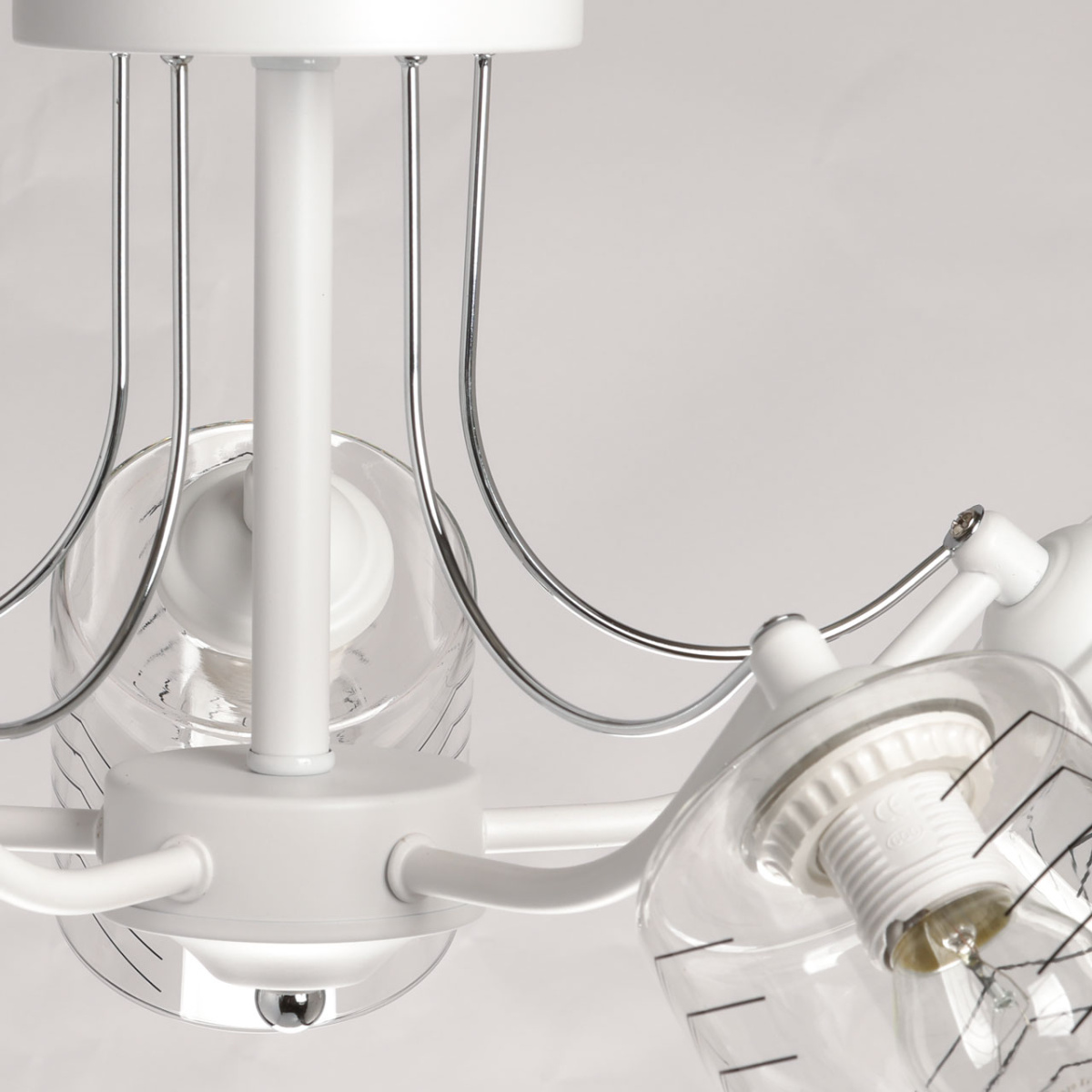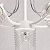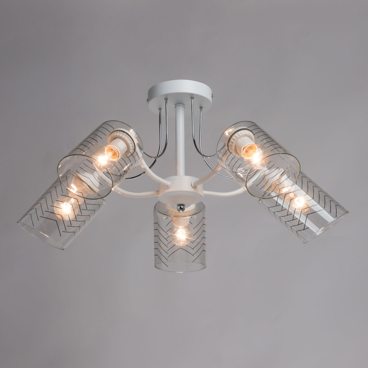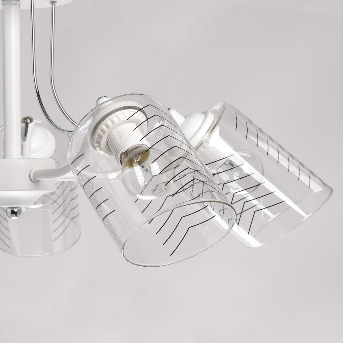 Металлическое основание потолочной люстры окрашено в белый цвет. Отдельные элементы основания гальванизированы в цвет хрома. На прозрачные стеклянные плафоны вытянутой формы нанесен геометричный орнамент.