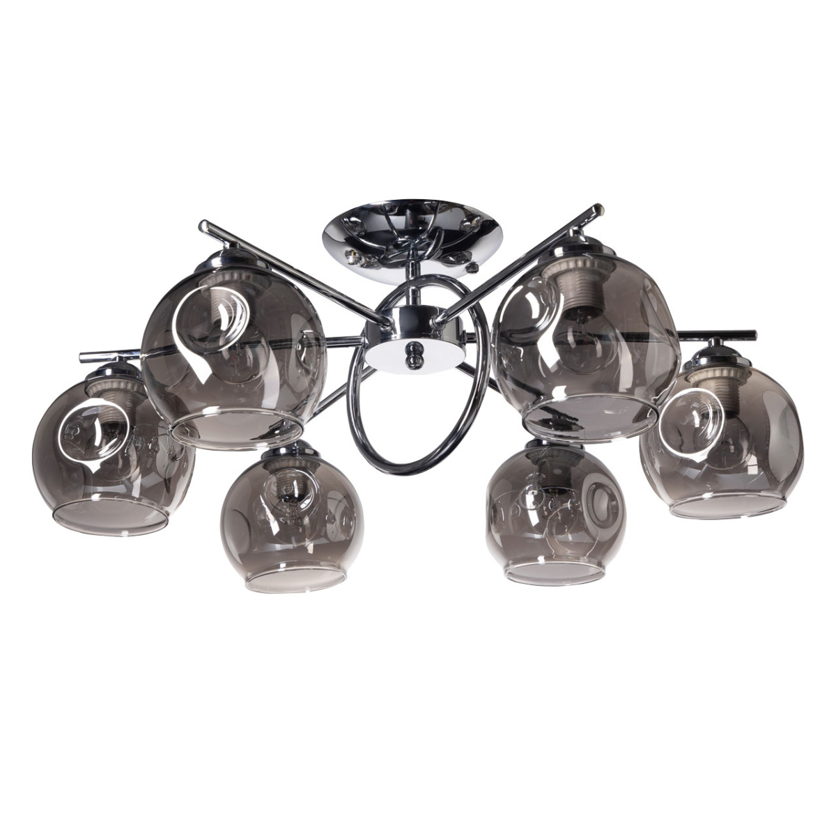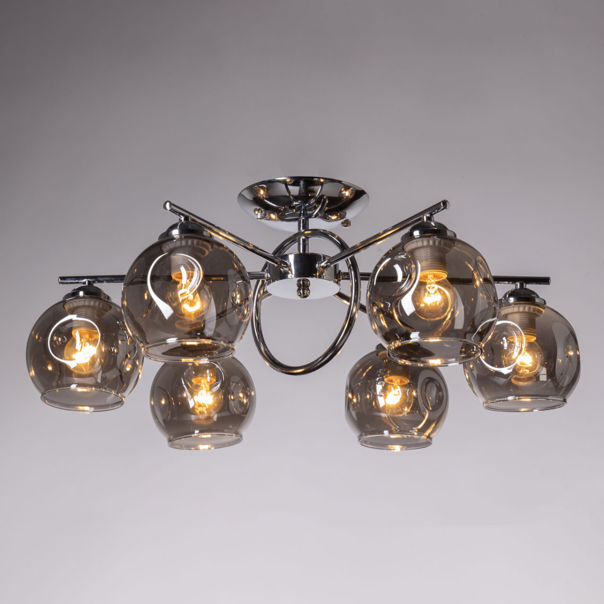 Металлическое основание светильника гальванизировано в цвет хрома. Потолочная люстра декорирована выдувными вручную стеклянными плафонами. Плафоны гальванизированы в дымчатый металлизированный цвет.