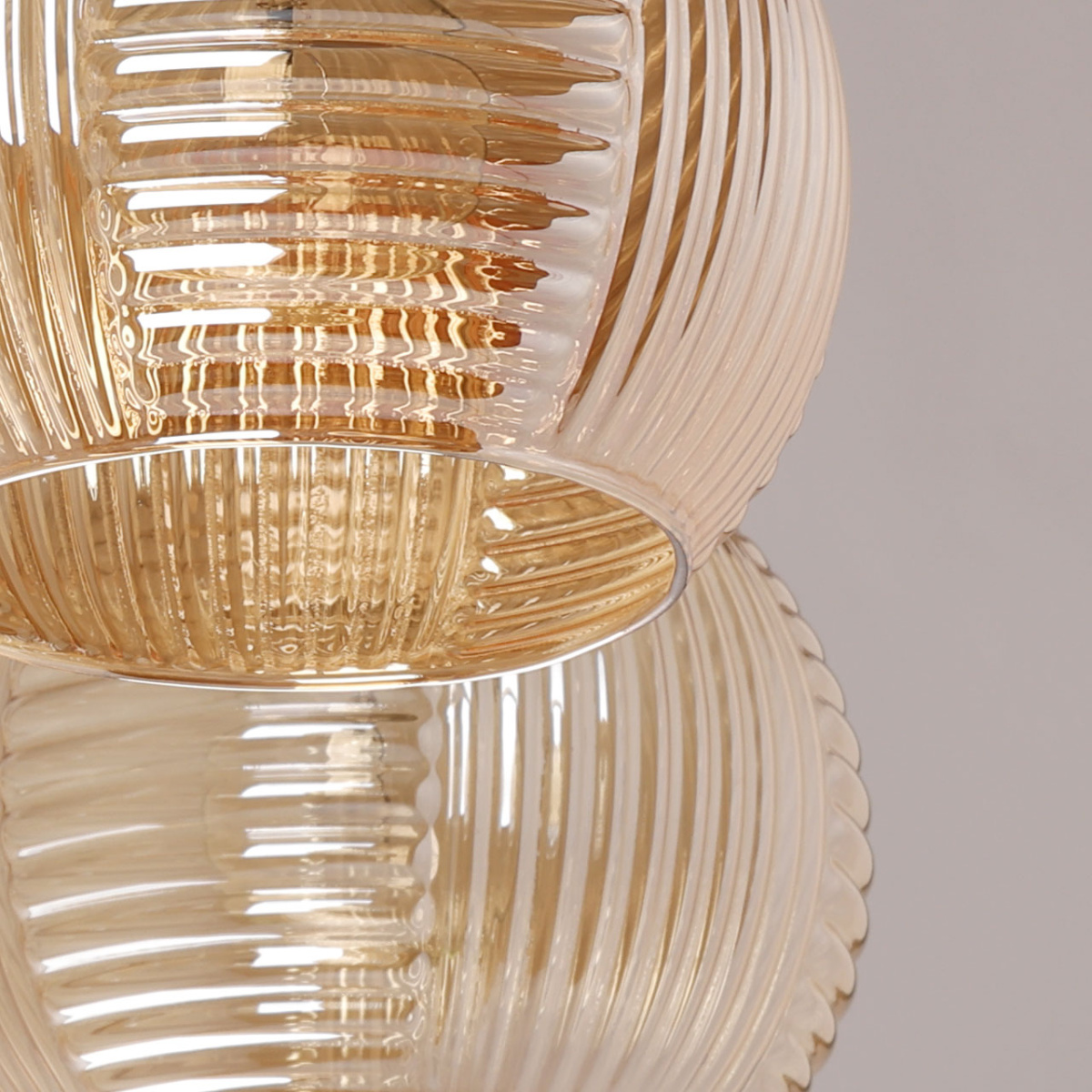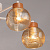 Металлическое основание потолочной люстры окрашено в белый цвет. Фактурные стеклянные плафоны, гальванизированные в цвет коньяк, выдуваются в форму вручную. Люстра декорирована металлическими элементами, имитирующими светлое дерево по технологии иммерсионной печати.