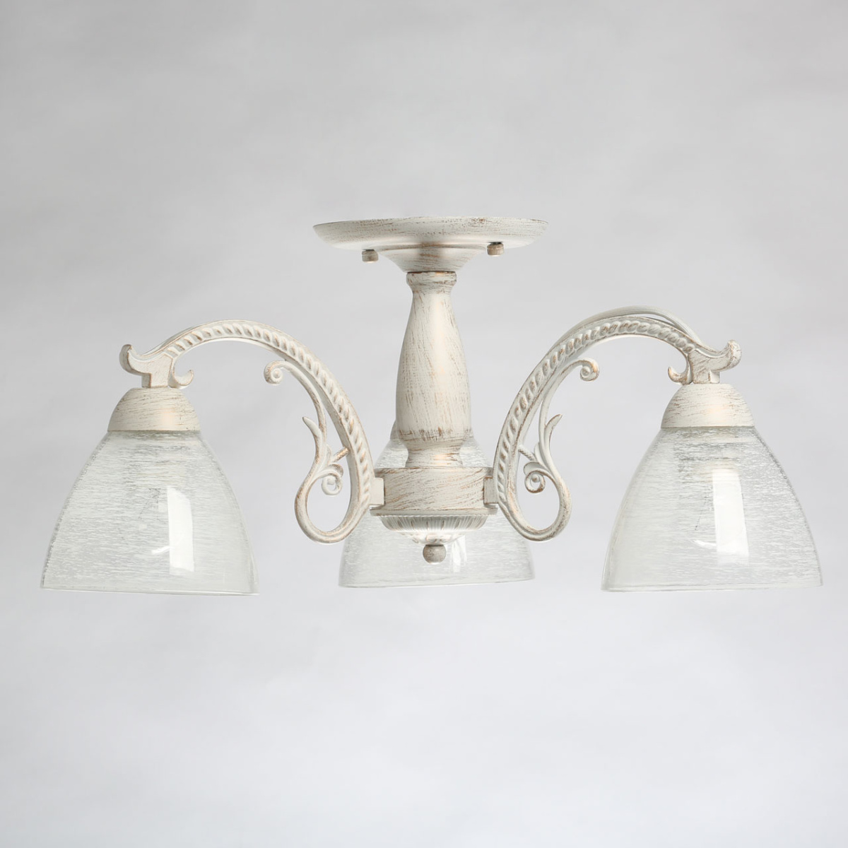 Основание светильника выполнено из комбинации сплавов металлов и обработано по технологии хай-лайт, где основной слой белого цвета, а декоративный слой - золотого. Рожки выполнены из сплава алюминия по технологии художественного литья. На стеклянные плафоны нанесен рисунок белой краской в виде паутинки.