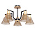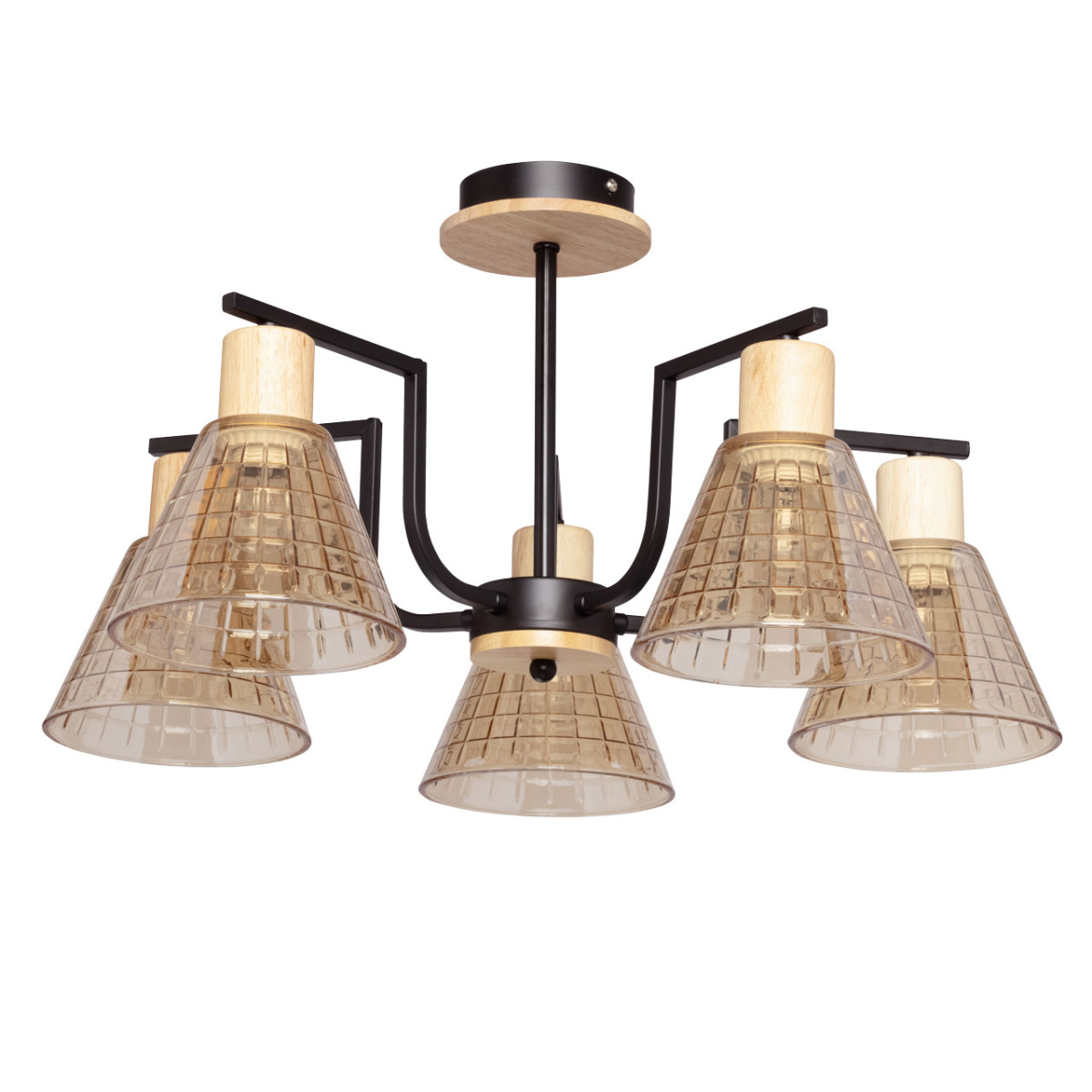 Металлическое основание потолочной люстры окрашено в черный цвет. Стеклянные плафоны отлиты в сложную форму и гальванизированы в цвет шампань. Светильник декорирован элементами из натурального светлого дерева.