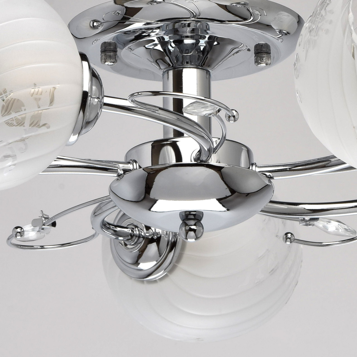 Основание светильника выполнено из металла, гальванизация в цвет хрома. Потолочная чаша, корпус, держатели плафонов изготовлены по технологии токарная обработка, рожки и завитки - прокат на роликовом станке.Светильник декорирован стеклянными плафонами, отлитыми в сложную форму, с последующим матированием внешней поверхности по трафарету. Края плафонов оплавлены.Декоративные элементы на завитках из декоративного стекла в форме миндаля.