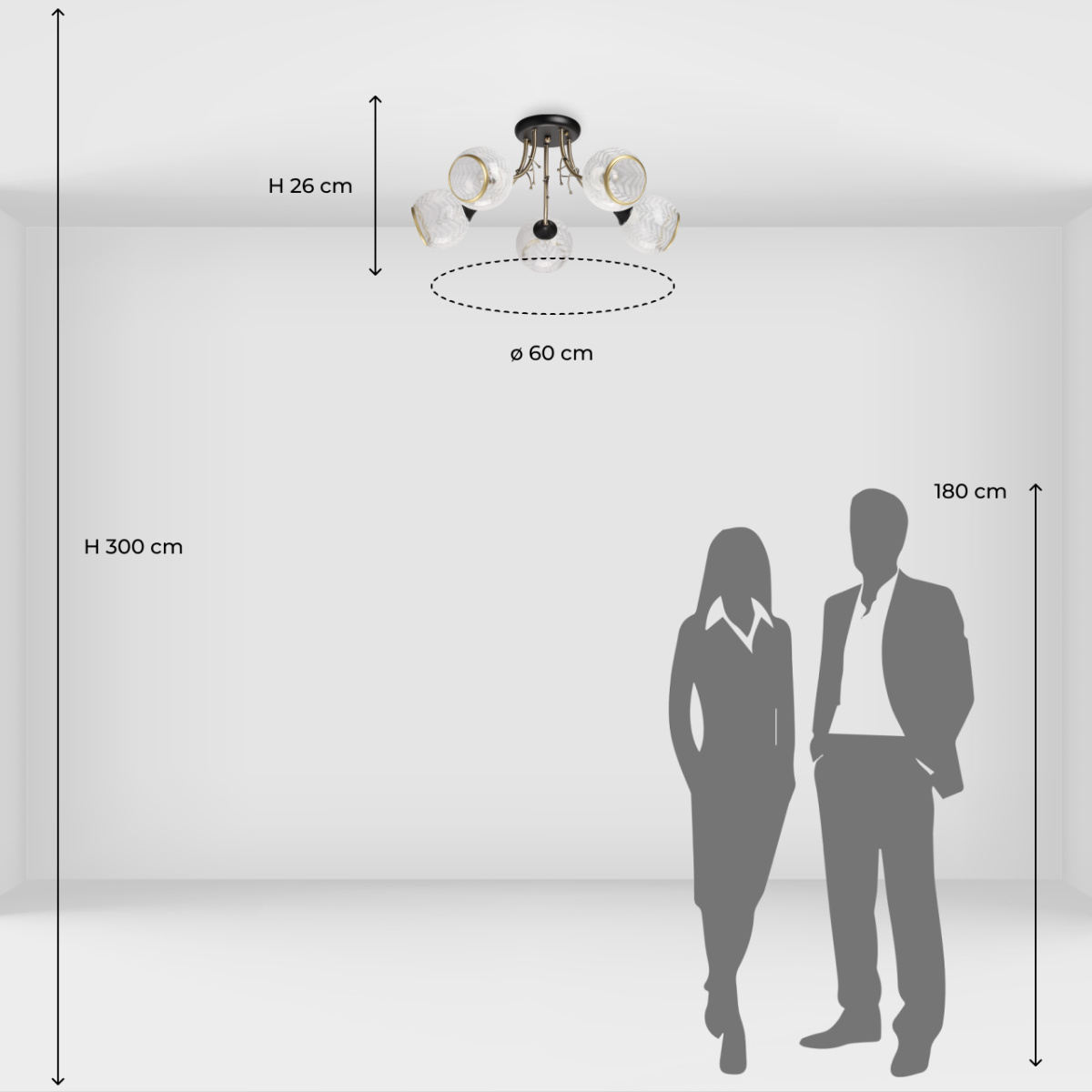 Металлическое основание подвесной люстры гальванизировано в цвет латуни. Отдельные элементы основания окрашены в черный цвет. Плафоны отлиты вручную и матированы по трафарету в растительный мотив. Края плафонов отделаны кантом цвета латуни.