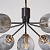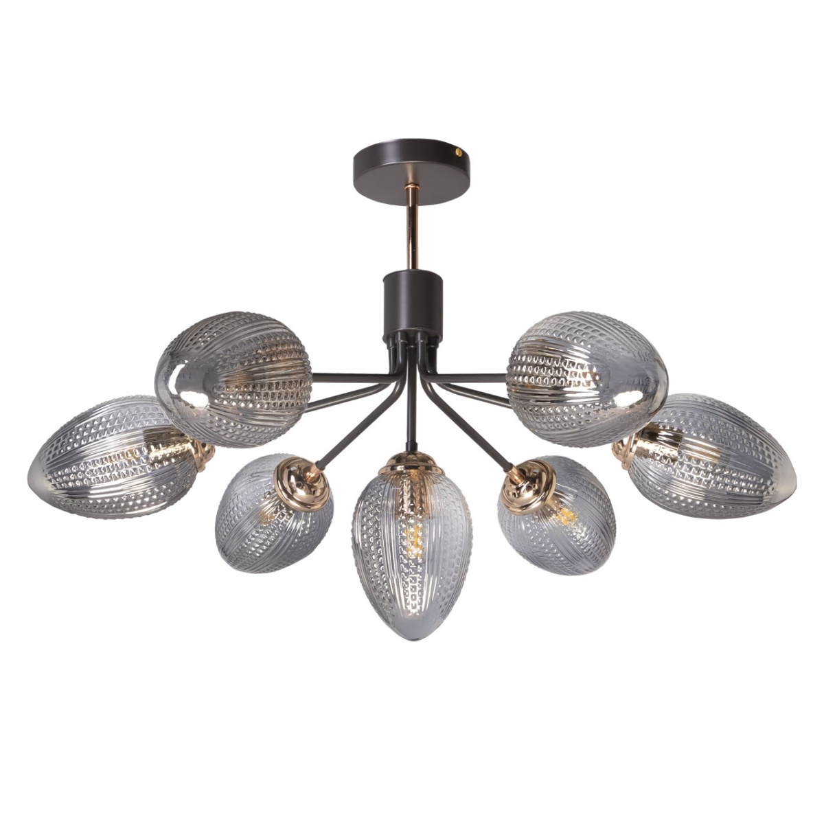 Металлическое основание потолочной люстры окрашено в цвет кофе. Отдельные элементы основания гальванизированы в цвет золота. Плафоны выполнены из фактурного стекла, отлитого в сложную форму и гальванизированного в дымчатый металлизированный цвет.