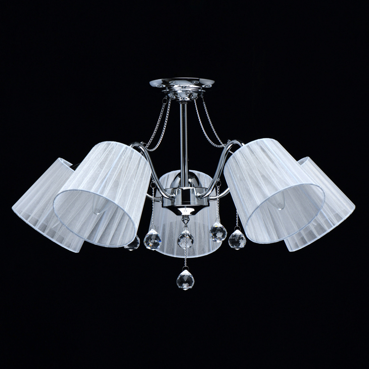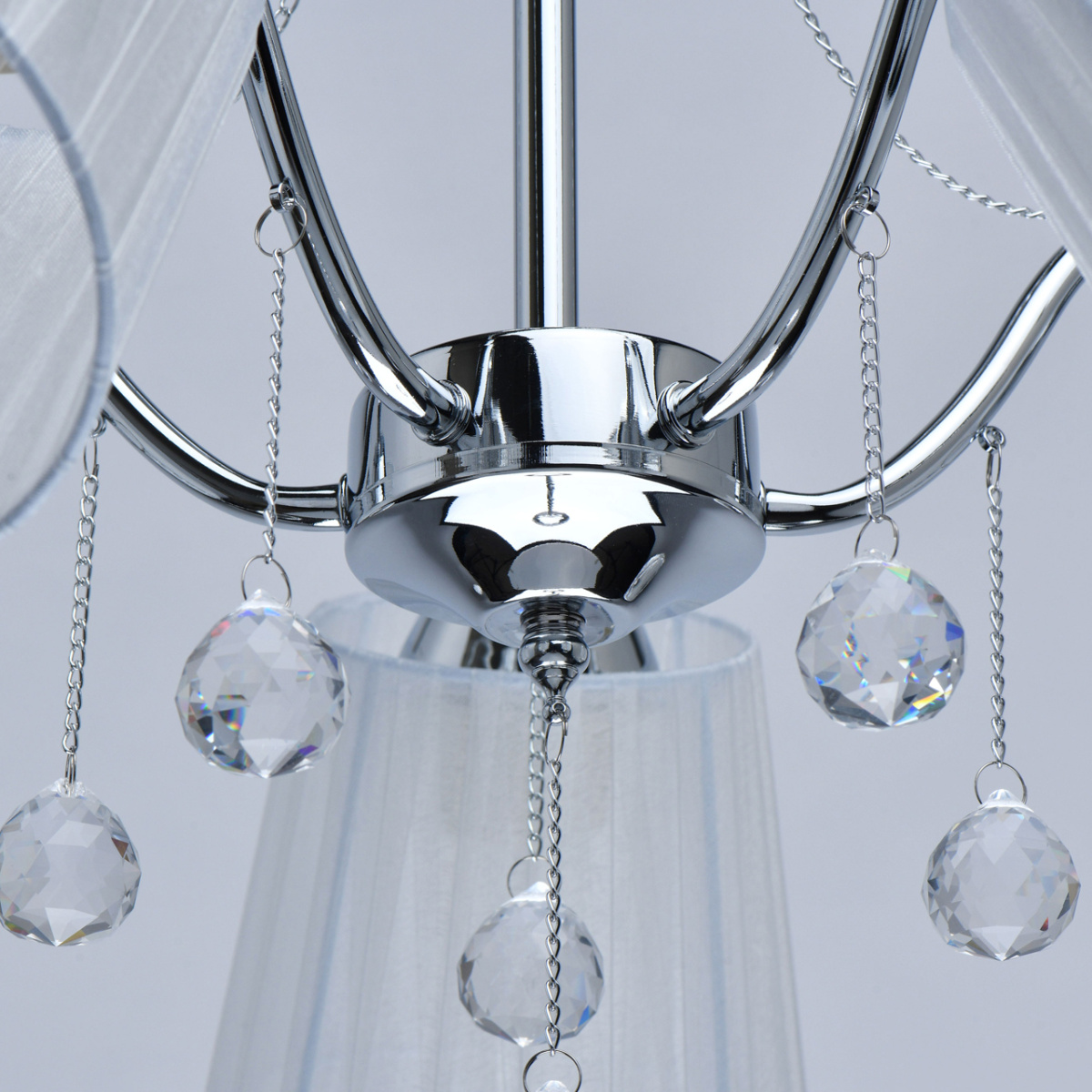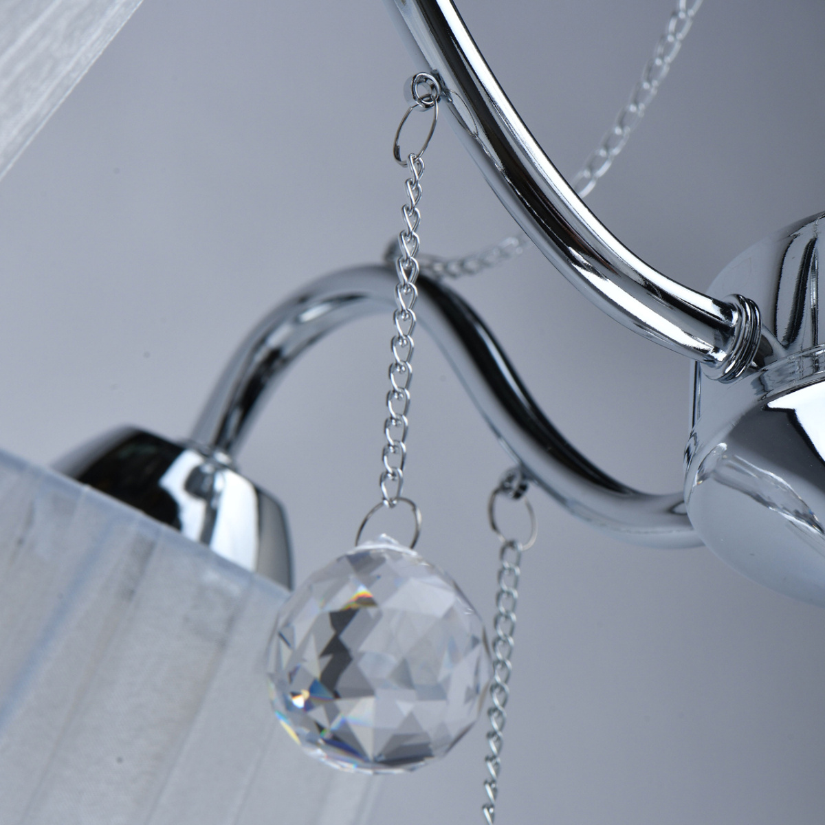 Основание светильника выполнено из сплава металла и гальванизировано в цвет хрома. Абажуры из прозрачной органзы белого цвета с термостойким акрилом внутри. Абажуры отделаны кантом сверху и снизу, прошиты. Светильник декорирован металлическими цепочками в цвет основания и прозрачным хрусталем в форме шара.