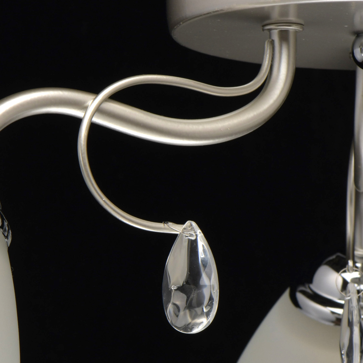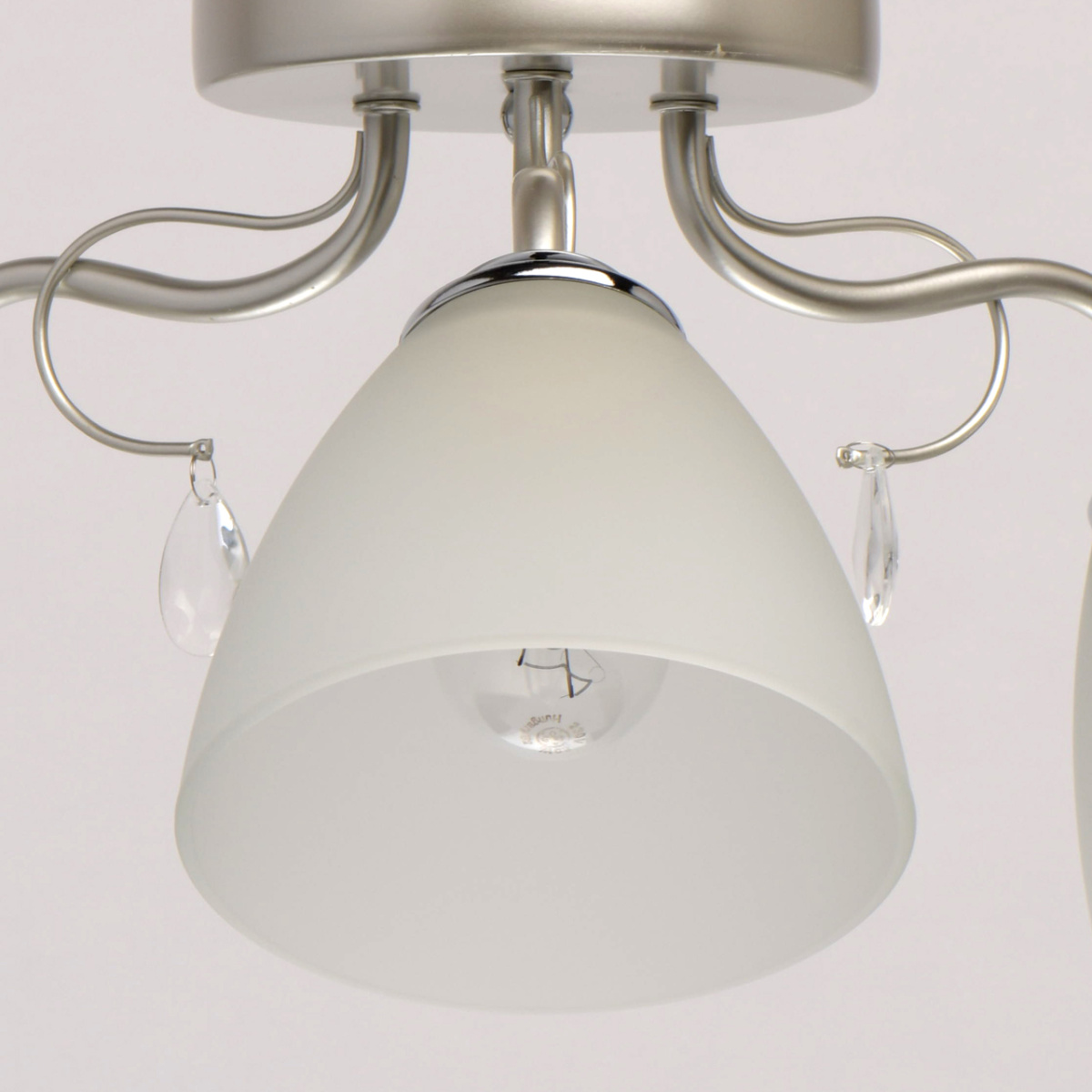 Основание светильника выполнено из металла и окрашено в цвет перламутрового серебра. Держатели плафонов гальванизированы в цвет хрома. Плафоны из матированного стекла. Светильник декорирован подвесками из стекла.