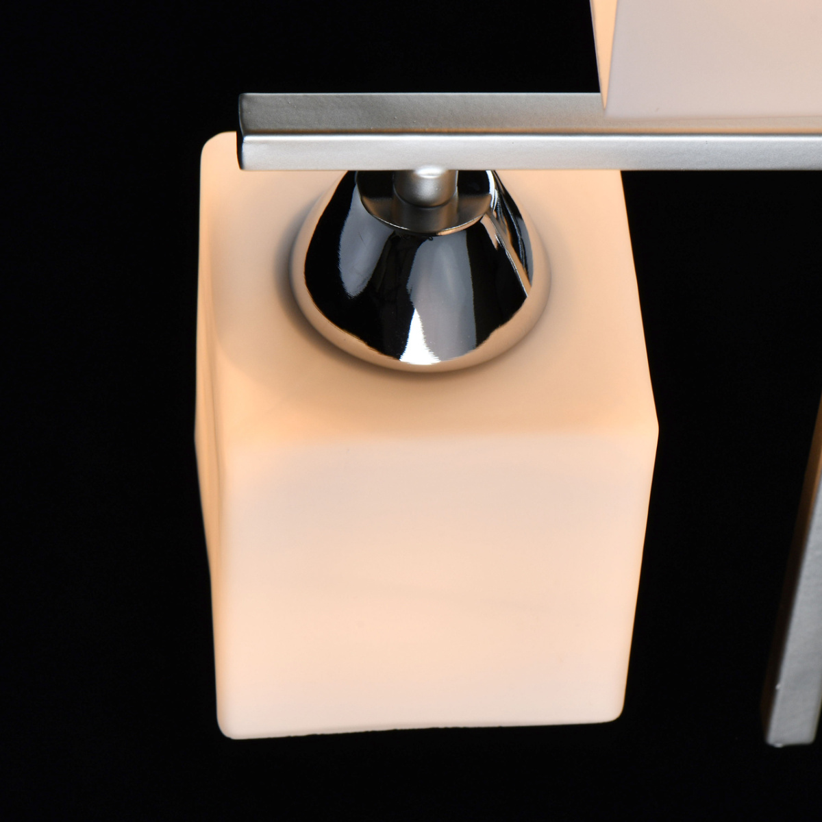 Основание светильника выполнено из металла и окрашено в цвет перламутрового серебра. Отдельные элементы основания гальванизированы в цвет хрома. Светильник декорирован стеклянными плафонами, окрашенными в белый цвет с внутренней стороны.