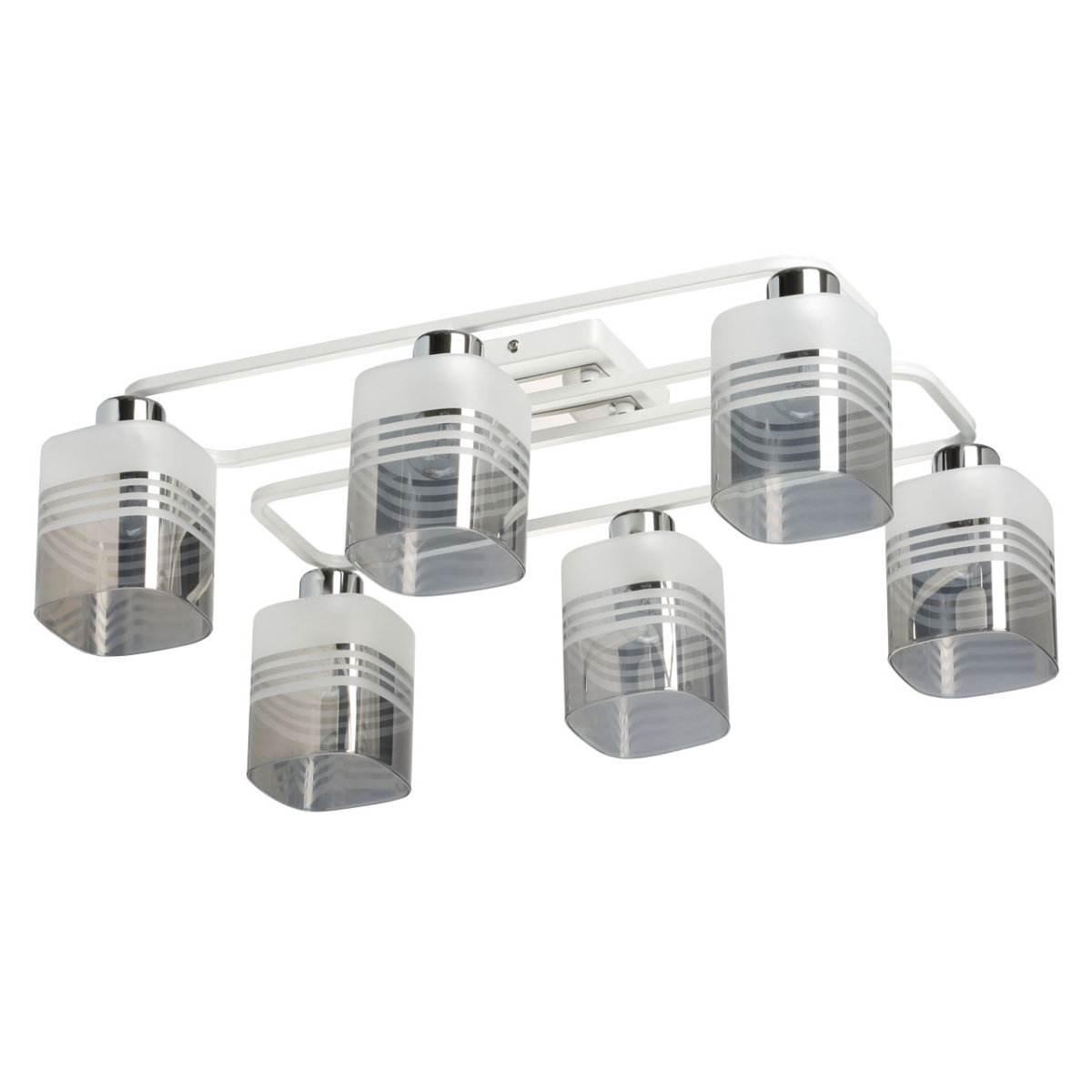 Металлическое основание потолочного светильника окрашено в белый цвет. Отдельные элементы гальванизированы в цвет хрома. Стеклянные плафоны гальванизированы в дымчатый цвет и окрашены в белый цвет в виде параллельных полос