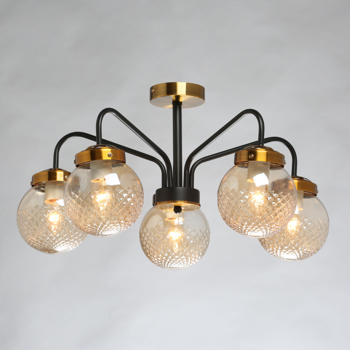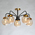 Основание светильника выполнено из металла. Потолочная чаша и держатели плафонов гальванизированы в цвет бронзы, рожки окрашены в черный цвет. Стеклянные плафоны отлиты в сложную фактурную форму и гальванизированы в цвет коньяк