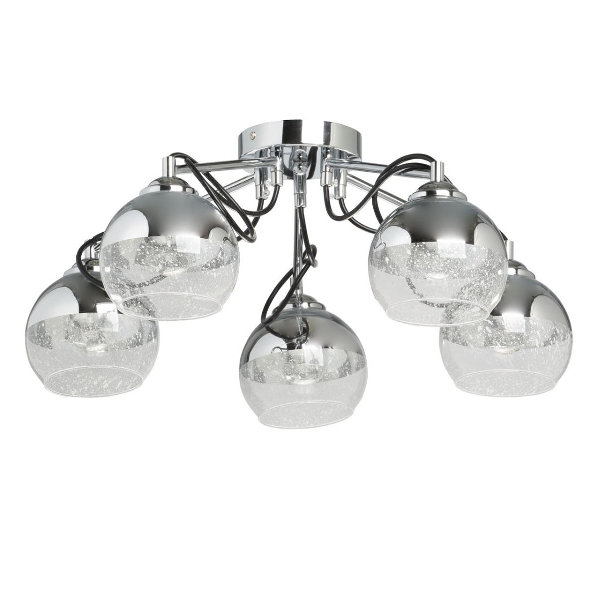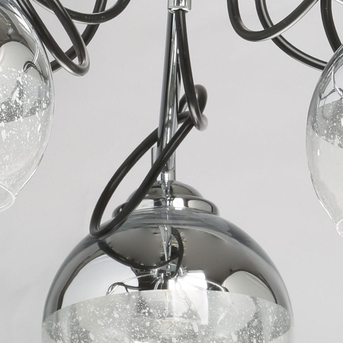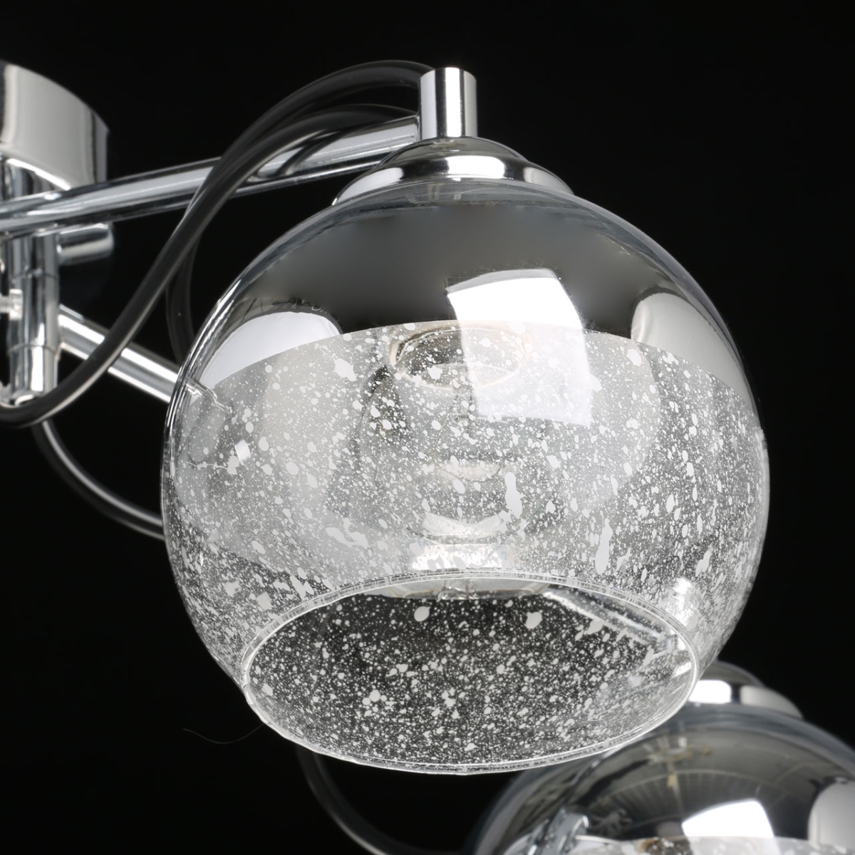 Металлическое основание потолочного светильника гальванизировано в цвет хрома. Светильник декорирован стеклянными плафонами, гальванизированными у основания в цвет хрома. На прозрачную часть плафона вручную нанесен хаотичный рисунок в виде капель белого цвета.