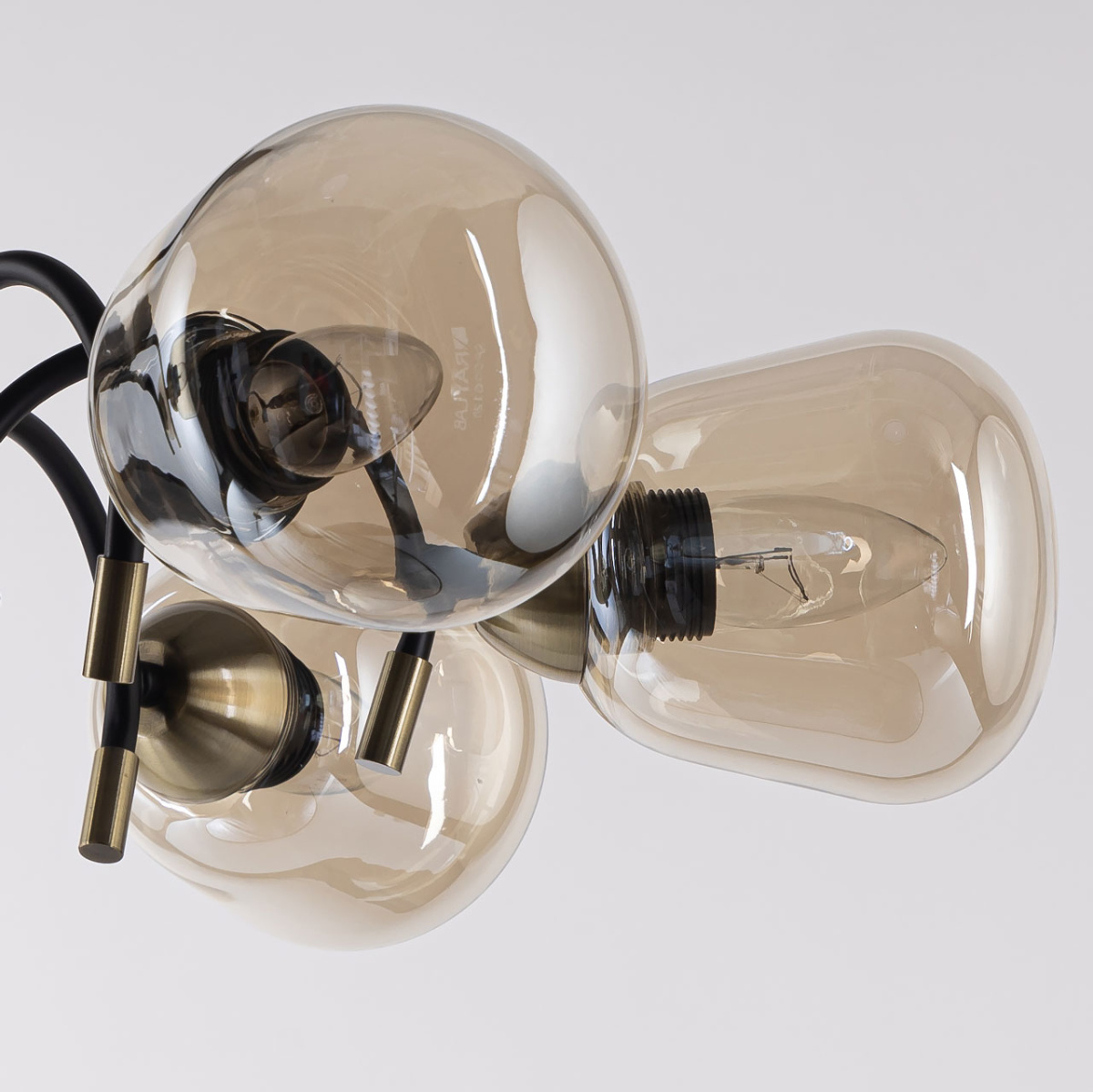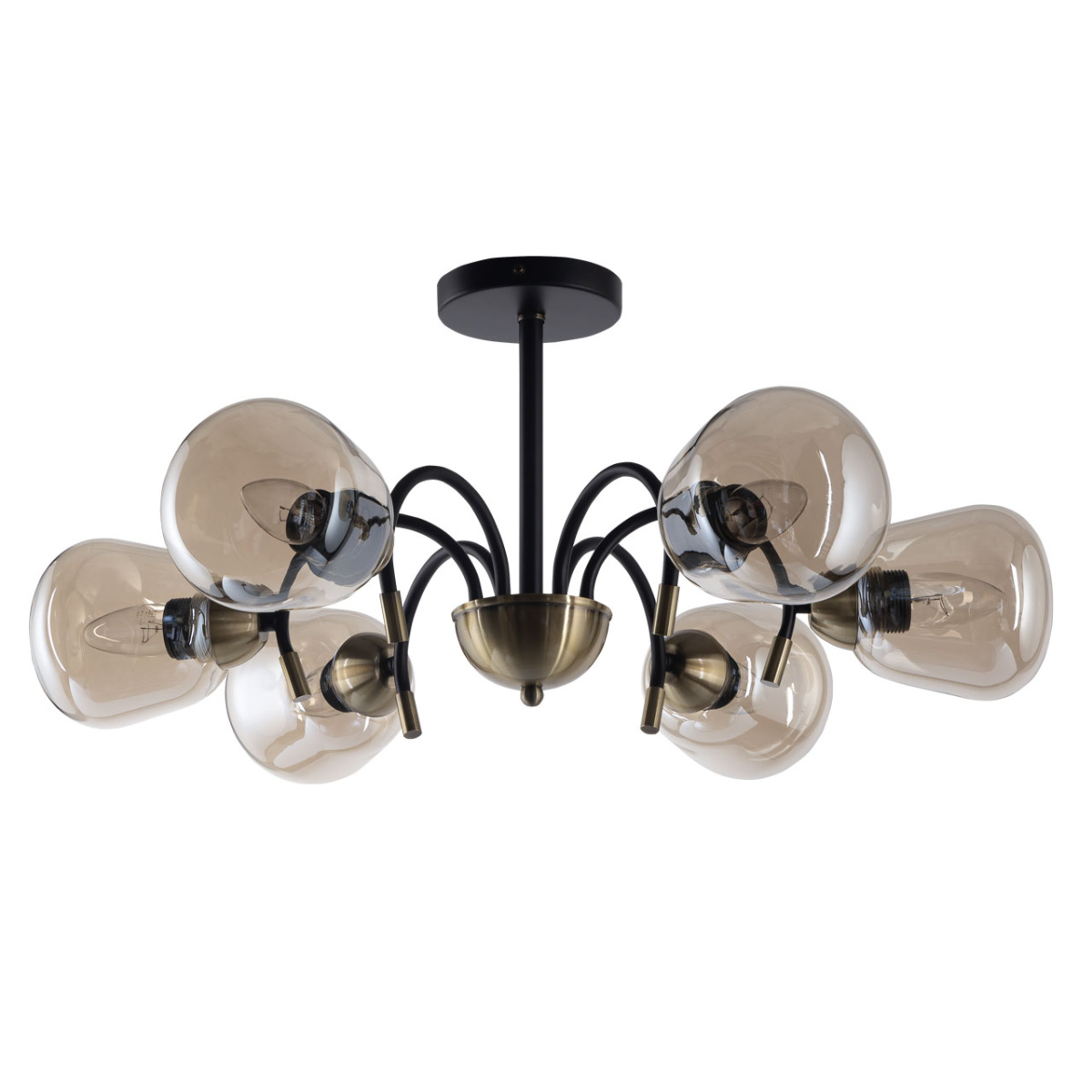 Металлическое основание подвесной люстры окрашено в черный цвет. Отдельные элементы основания гальванизированы в цвет античной бронзы. Светильник декорирован стеклянными вытянутыми плафонами цвета шампань.